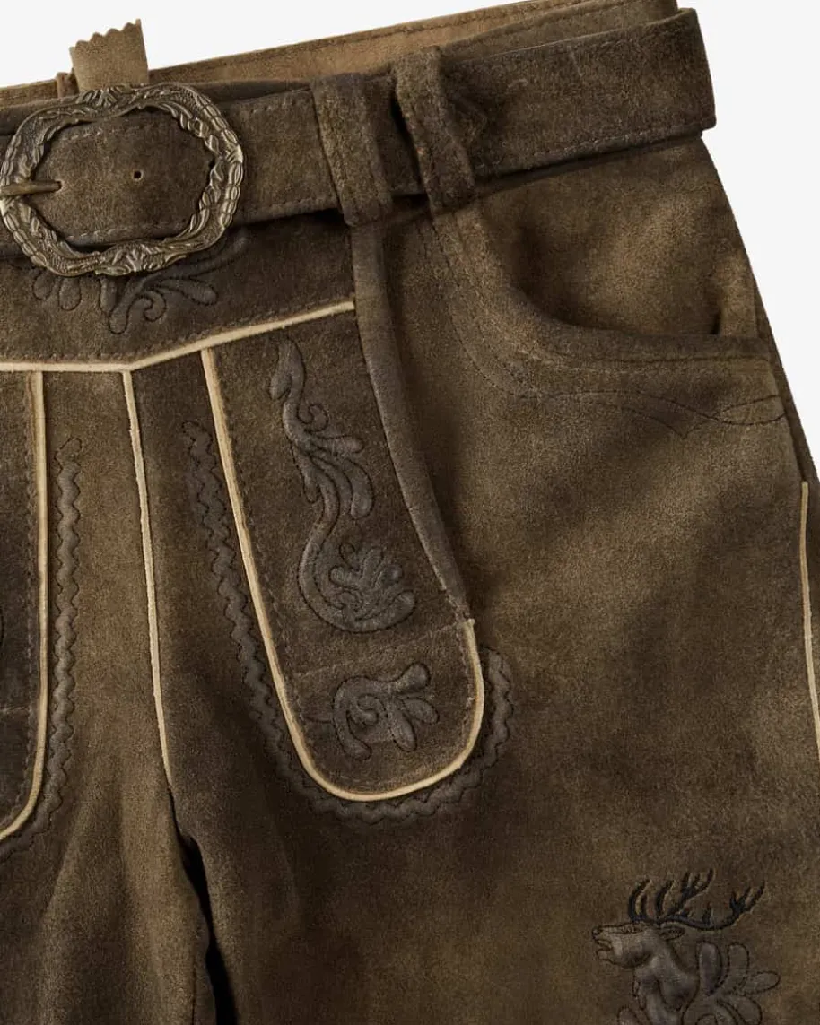 Achill Lederhose kurz für Jungen von Spieth & Wensky in Braun. Die Mini-Tracht zeichnet sich durch die hochwertige Leder-Verarbeitung aus, währendstilvolle Relief-Stickereien als auch rustikale Hornknöpfe den traditionellenLook gekonnt in Szene setzen.