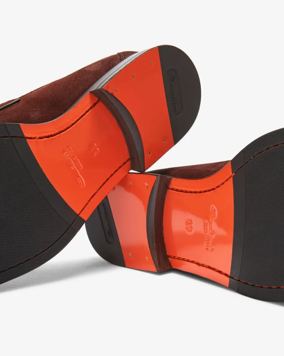 Airglow Penny Loafer für Damen von Santoni in Dunkelbraun. HöchsteHandwerkskunst gepaart mit klassisch britischem Design – die Schuhe derSchuhmanufaktur Santoni stehen für einen unvergleichlichen Stil, welcher nebeneinem hohen Qualitätsanspruch auch durch perfektionierte Formen und eineerstklassige Passform begeistert. Auch dieses zeitlose Modell besticht mit derhochwertigen Veloursleder-Qualität, während die hochwertige, charakteristischeorange Ledersohle mit Gummieinsätzen Sie stilsicher auftreten lässt.