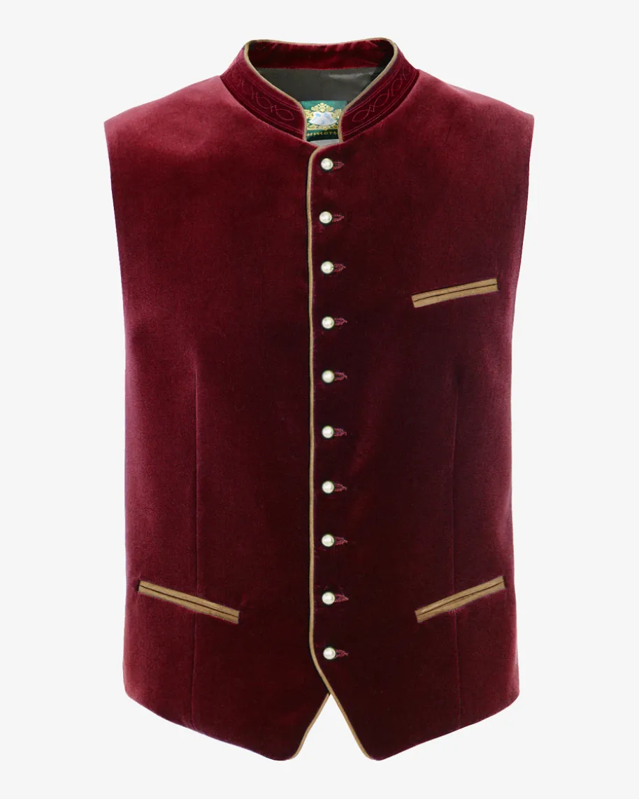 Albrecht Trachtenweste für Herren von Hammerschmid in Bordeaux. Weiches Samt ander Vorderseite, der zeitlose Schnitt sowie die filigranen Stickereien amStehkragen machen die Weste zum stilsicheren Begleiter zur Lederhose.