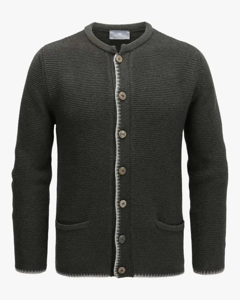 Alex Trachten-Cashmere-Strickjacke für Herren von LODENFREY in Oliv undHellgrau. Das Modell aus besonders weicher Cashmere-Qualität besticht dankklassischem Strick-Dessin in traditioneller Aufmachung, während diePaspelierungen sowie Holz-Knöpfe den Trachten-Look harmonisch vollenden.