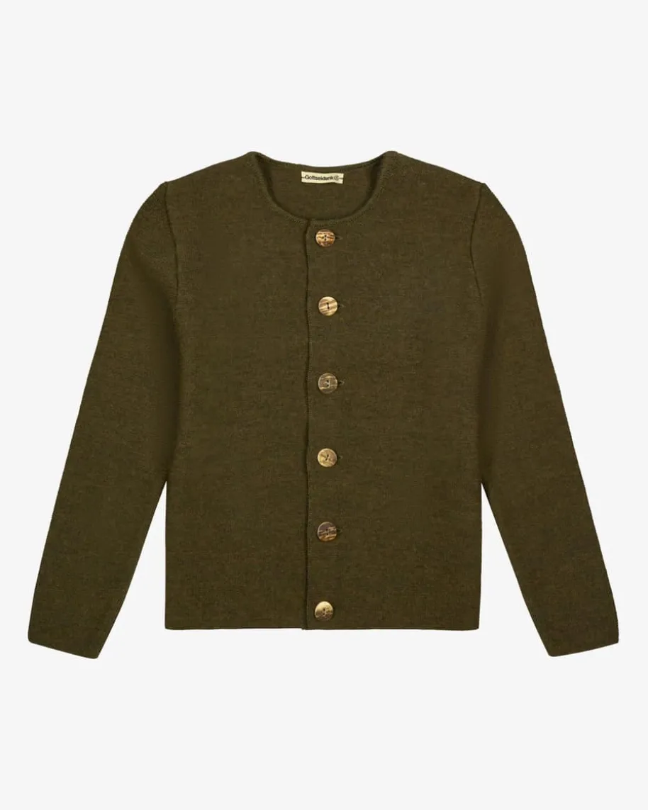 Alex Trachten-Strickjacke für Jungen von Gottseidank in Dunkeloliv. Traditionellund detailverliebt – Das Modell begeistert dank der stilvollen Hornknöpfe sowieder Verwendung von extrafeiner Merinowolle als weicher Begleiter für moderneTrachten-Looks.