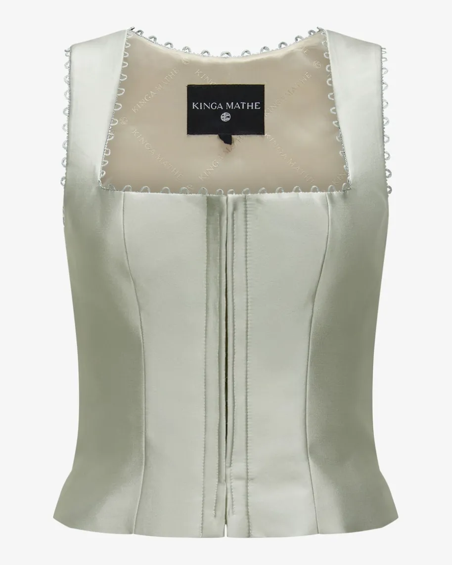 Alva Trachten-Mieder für Damen von Kinga Mathe in Salbei. Mit diesemchangierenden Spencer-Modell erhalten Sie einen modischen und dennochtraditionellen Eyecatcher für vielseitige Trachten-Looks – egal ob kombiniertzum femininen Rock oder zur rustikalen Lederhose.
