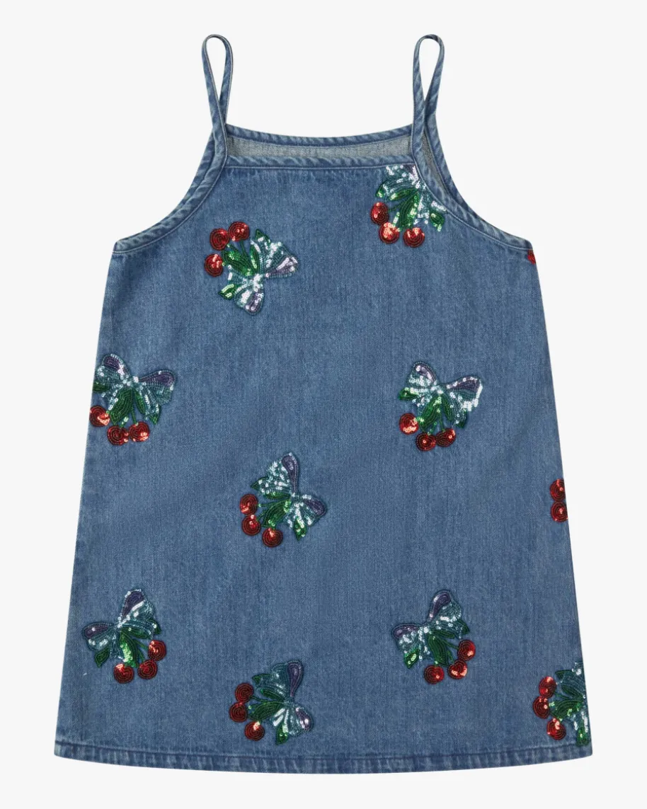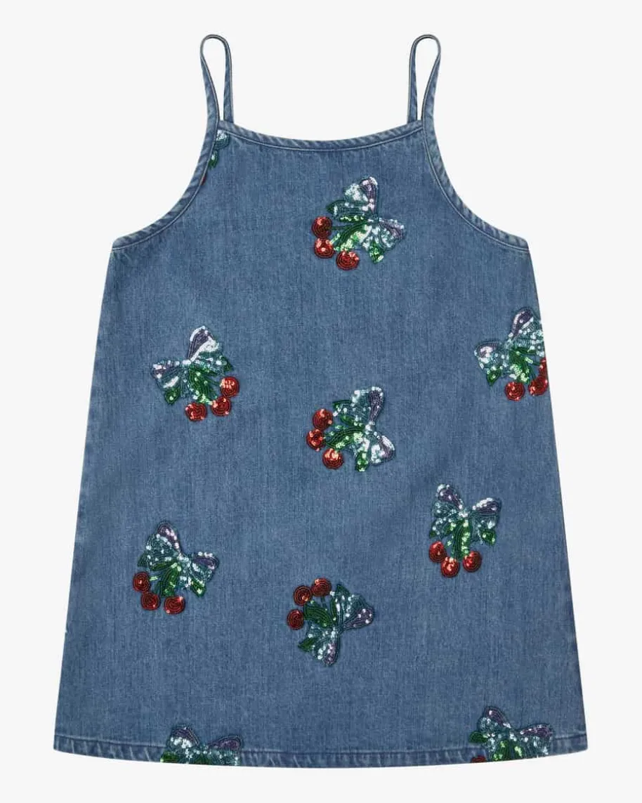 Amarena Jeanskleid für Mädchen von Konges Slojd in Blau, Rot und Grün. DänischesDesign für Babys & Kinder – nachhaltig, stylisch, durchdacht. Auch dieses Modellbegeistert mit GOTS zertifiziertem Baumwoll-Denim, während die süßen Pailletten-Applikationen mit Kirschen-Motiv den niedlichen Style harmonisch abrunden.