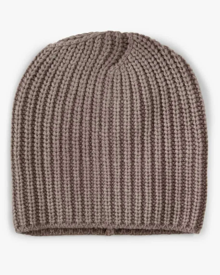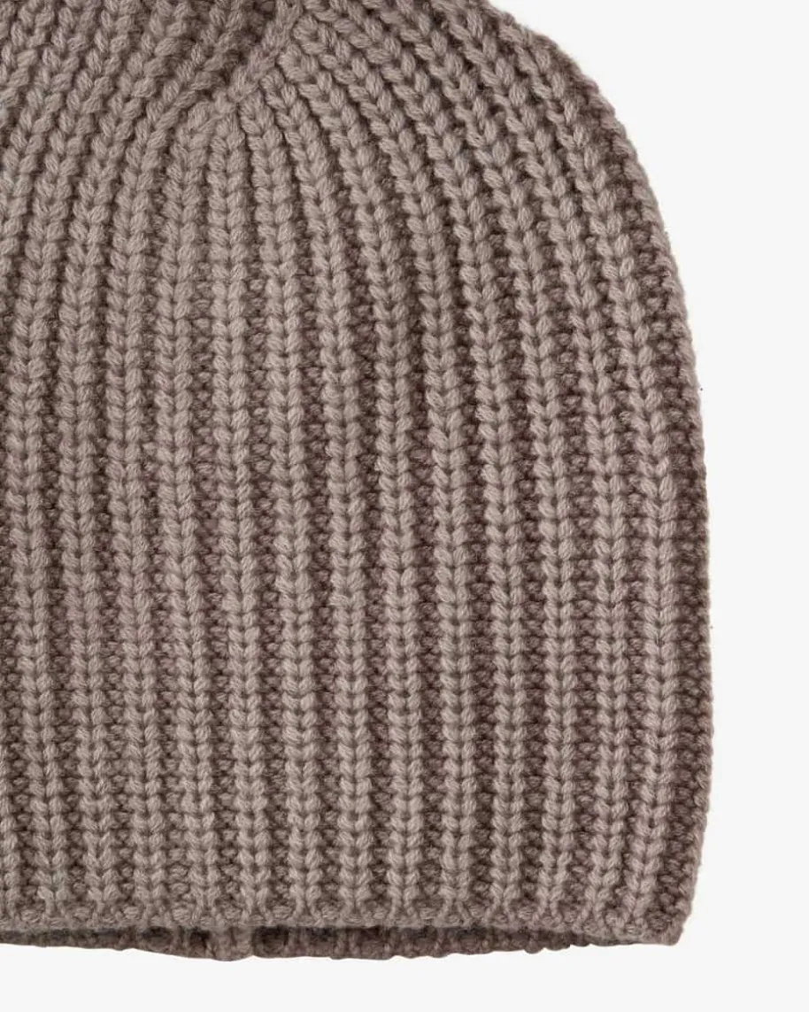 Amel Cashmere-Mütze von Iris von Arnim in Taupe. Das Modell aus weicherCashmere-Wolle überzeugt im klassischen Design mit grobem Rechtsstrick-Muster.