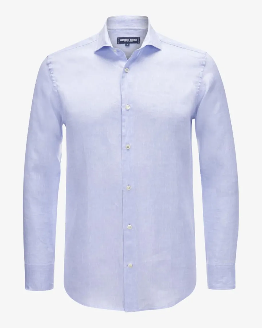 Antonio Leinenhemd für Herren von Frescobol Carioca in Hellblau. Das leichttaillierte Modell überzeugt dank der kühlenden Leinen-Qualität in melierterOptik, während klassische Details das legere Gesamtbild gekonnt ergänzen.