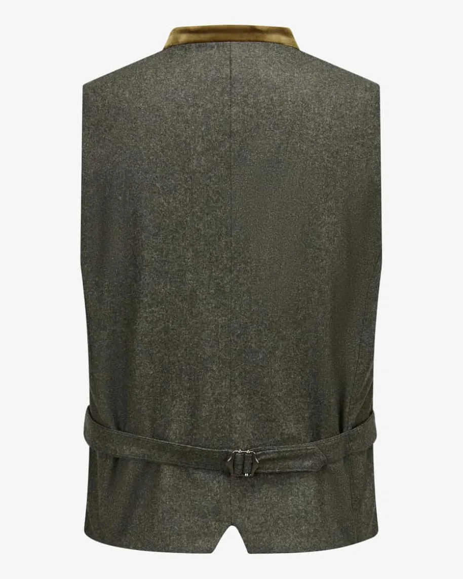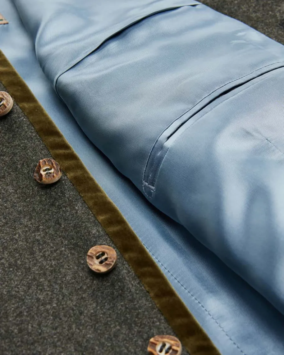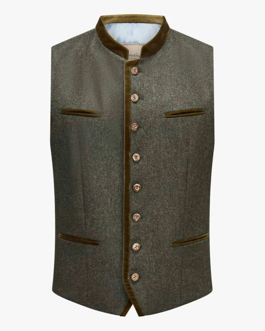Au Trachtenweste für Herren von Windsor in Anthrazit und Oliv. Das melierteModell überzeugtmit edlen Samt-Details und rustikalen Akzenten, während echte Hornknöpfe einenklassischen Blickfang für modische Trachten-Looks schaffen.