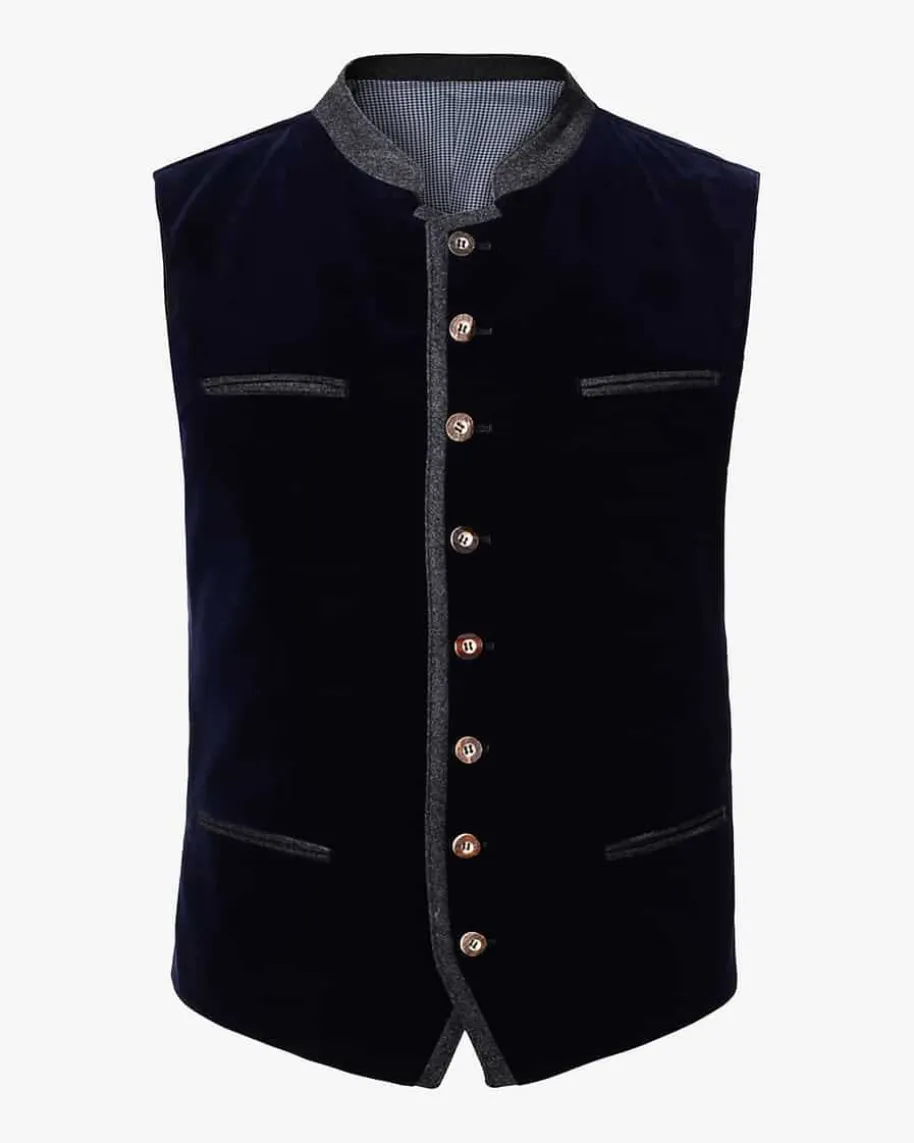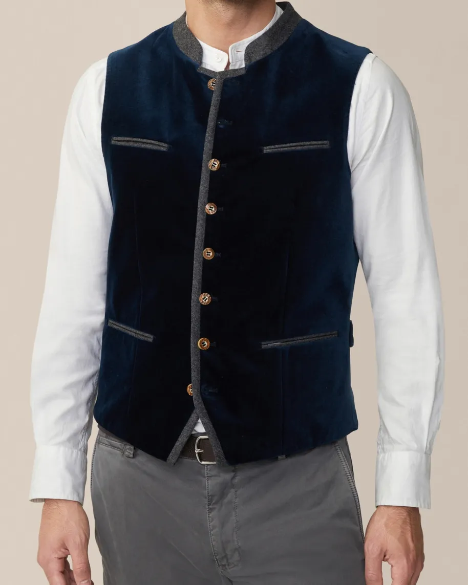 Au Trachtenweste für Herren von Windsor in Dunkelblau. Das modische Samt-Giletüberzeugt mit edlen Details und rustikalen Akzenten, während echte Hornknöpfeeinen klassischen Blickfang für modische Trachten-Looks schaffen.