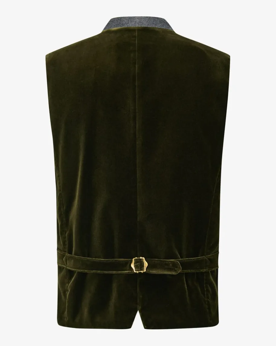 Au Trachtenweste für Herren von Windsor in Oliv und Anthrazit. Das Modell ausweichem Baumwoll-Samt überzeugt mit edlen Details und traditionellen Akzenten,während echte Hornknöpfe einen klassischen Blickfang für modische Trachten-Looksschaffen.