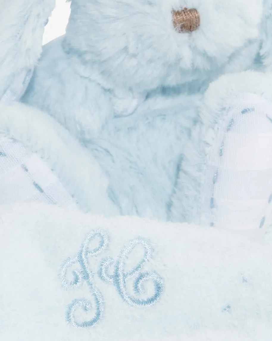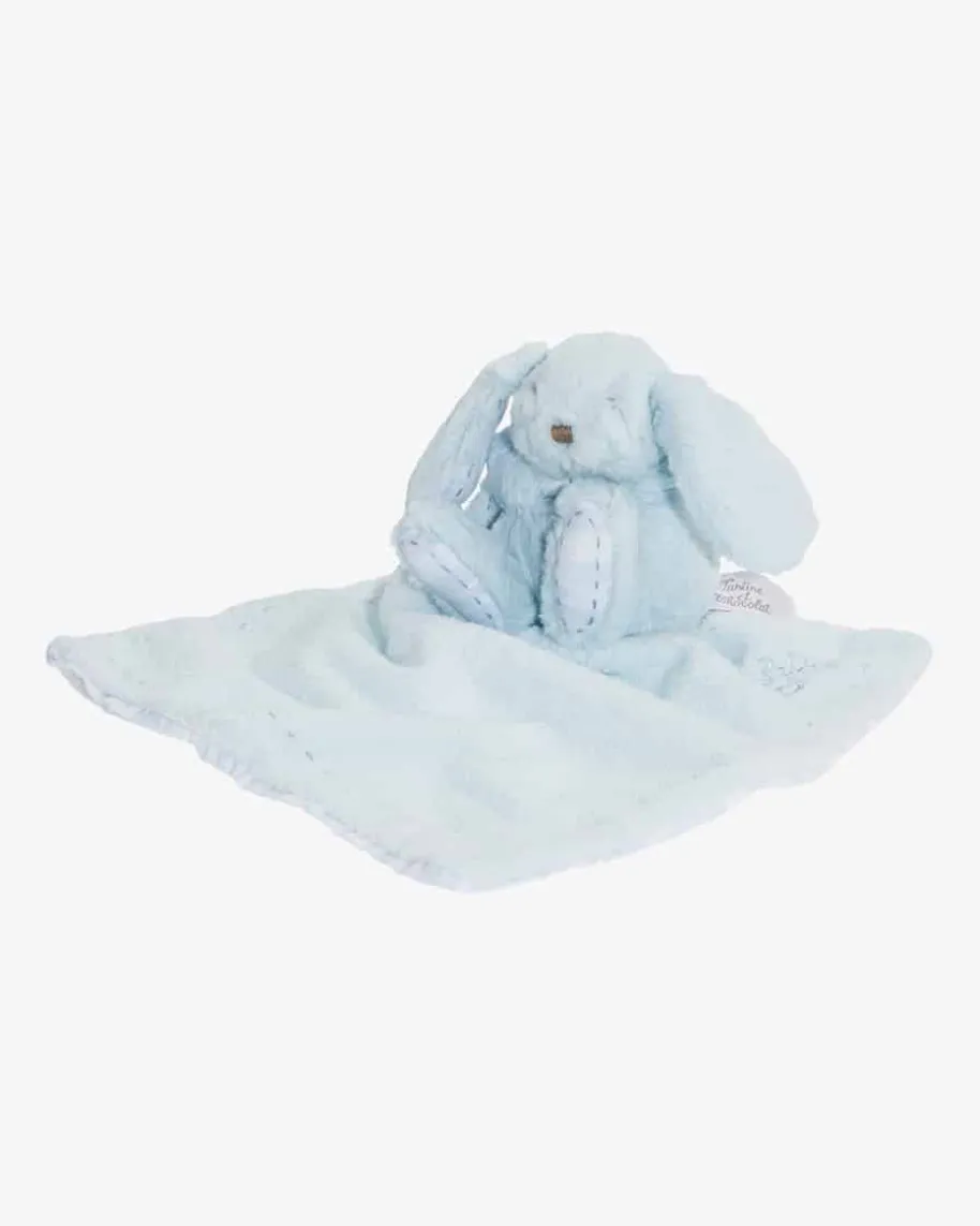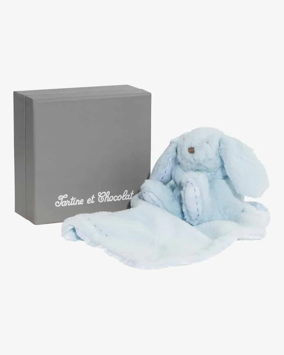 Augustin Plüschtier Hase mit Tuch von Tartine et Chocolat in Hellblau. Augustin ist ein kuscheliger Spielgefährte ebenso für kleine wie für große Kinder. Mit seinem flauschigen Fell ist das Stofftier ein toller Schmusepartner. Neben den süßen Ohren verstärken auch die stoffwattierten Füße die niedliche Optik. Für Abwechslung und Spaß beim Greifen sorgt die mit feinen Kunststoffperlen gefüllte Partie in den Ohren. Ein an das Häschen fixierte Schmusetuch mit Logo-Stickerei und Paspelierung sorgt für viel Spaß beim Kuscheln und Greifen. Inklusive der passenden Geschenkschachtel ist das Kuscheltier immer eine besonders gelungene Überraschung und somit das perfekte Geschenk, zum Beispiel für Geburtstage oder die Taufe.