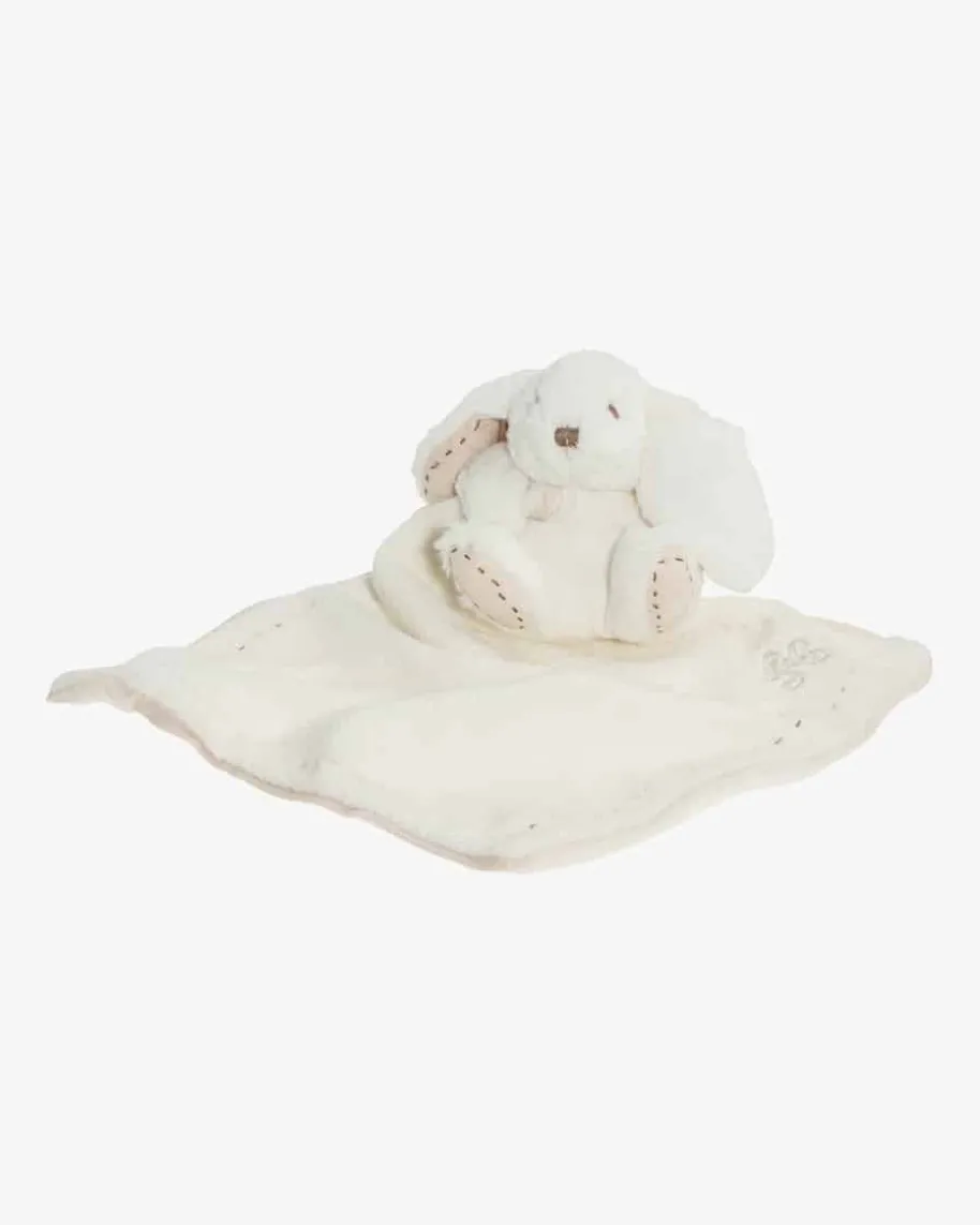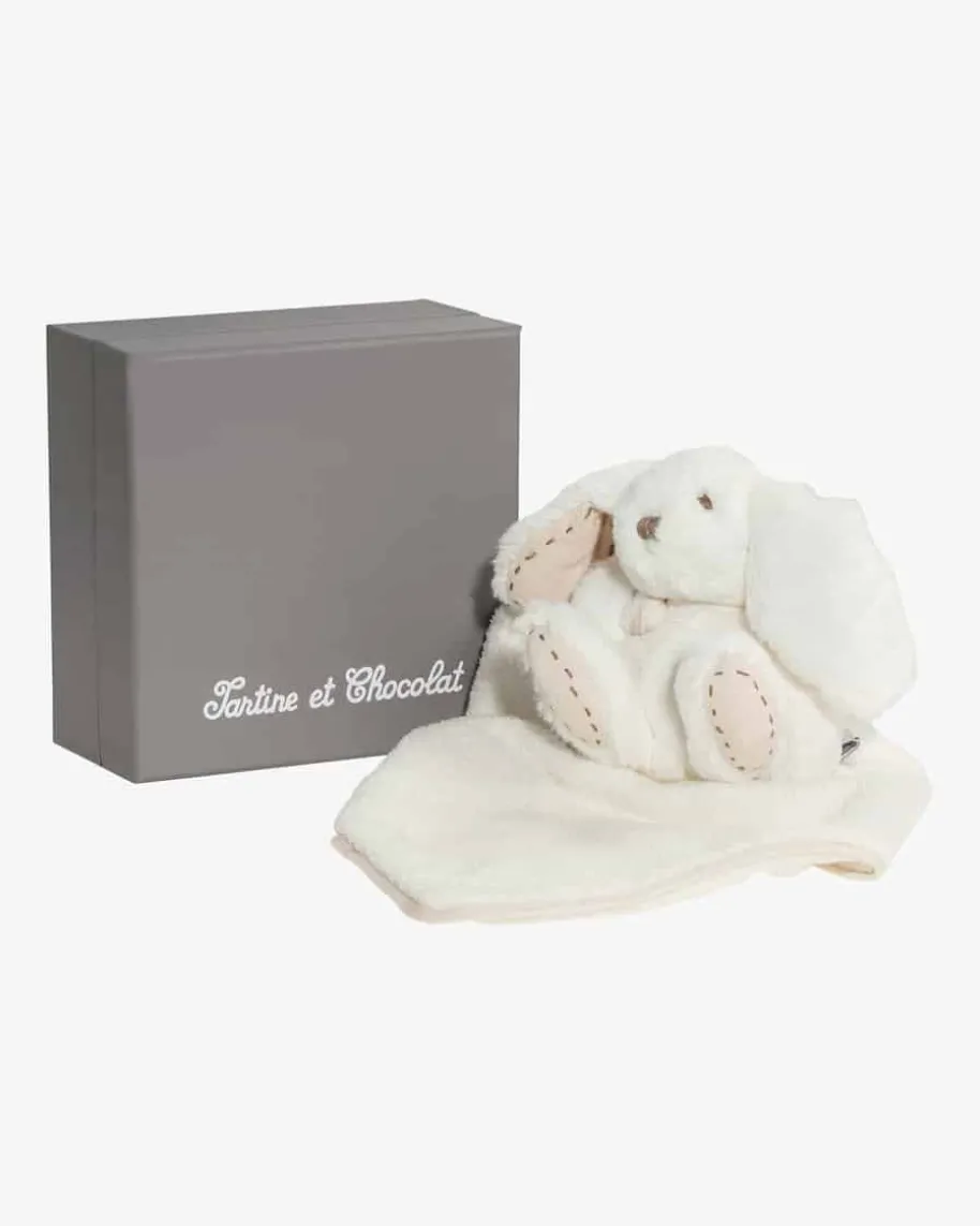 Augustin Plüschtier Hase mit Tuch von Tartine et Chocolat in Creme. Augustin ist ein kuscheliger Spielgefährte ebenso für kleine wie für große Kinder. Mit seinem flauschigen Fell ist das Stofftier ein toller Schmusepartner. Neben den süßen Ohren verstärken auch die stoffwattierten Füße die niedliche Optik. Für Abwechslung und Spaß beim Greifen sorgt die mit feinen Kunststoffperlen gefüllte Partie in den Ohren. Ein an das Häschen fixierte Schmusetuch mit Logo-Stickerei und Paspelierung sorgt für viel Spaß beim Kuscheln und Greifen. Inklusive der passenden Geschenkschachtel ist das Kuscheltier immer eine besonders gelungene Überraschung und somit das perfekte Geschenk, zum Beispiel für Geburtstage oder die Taufe.