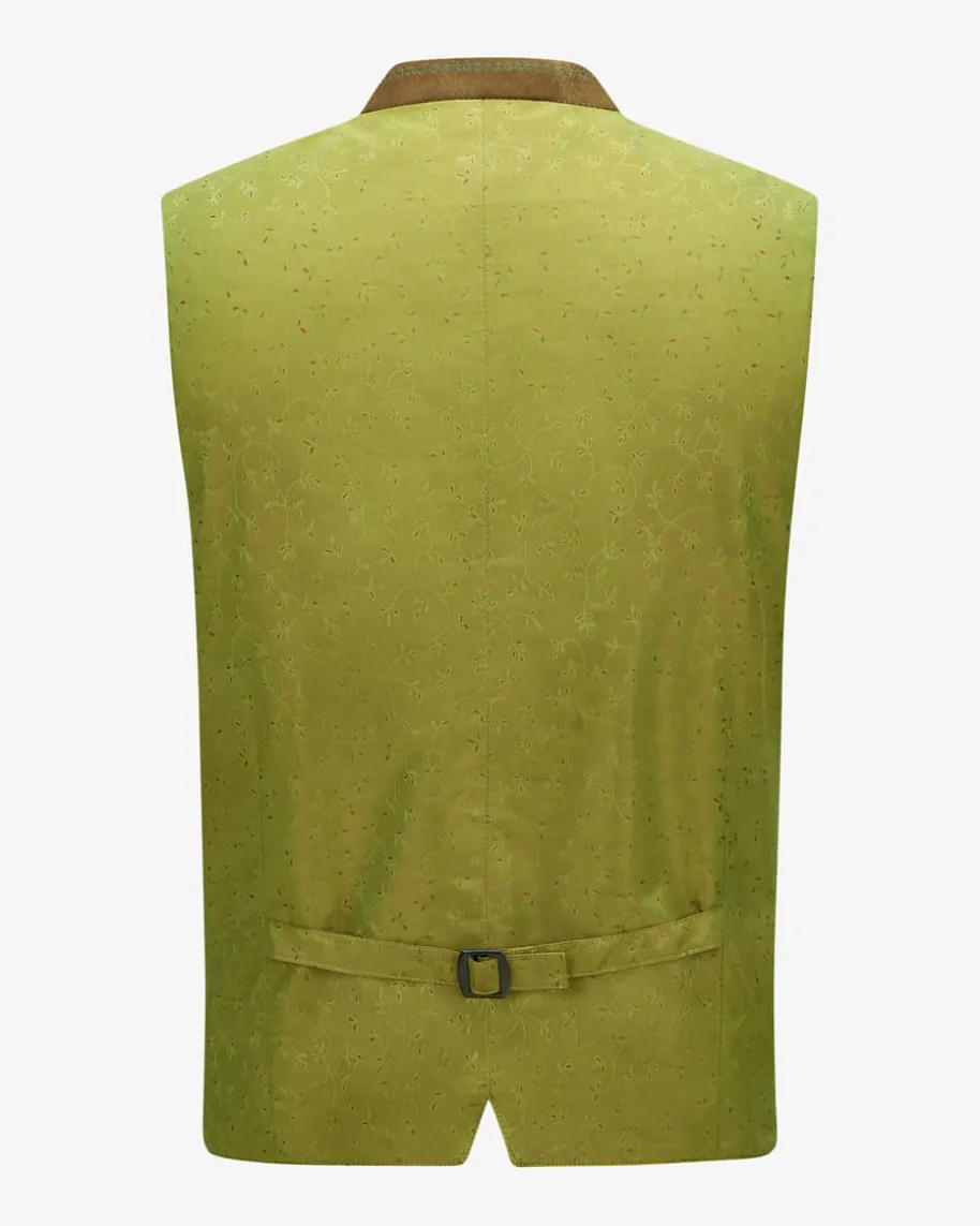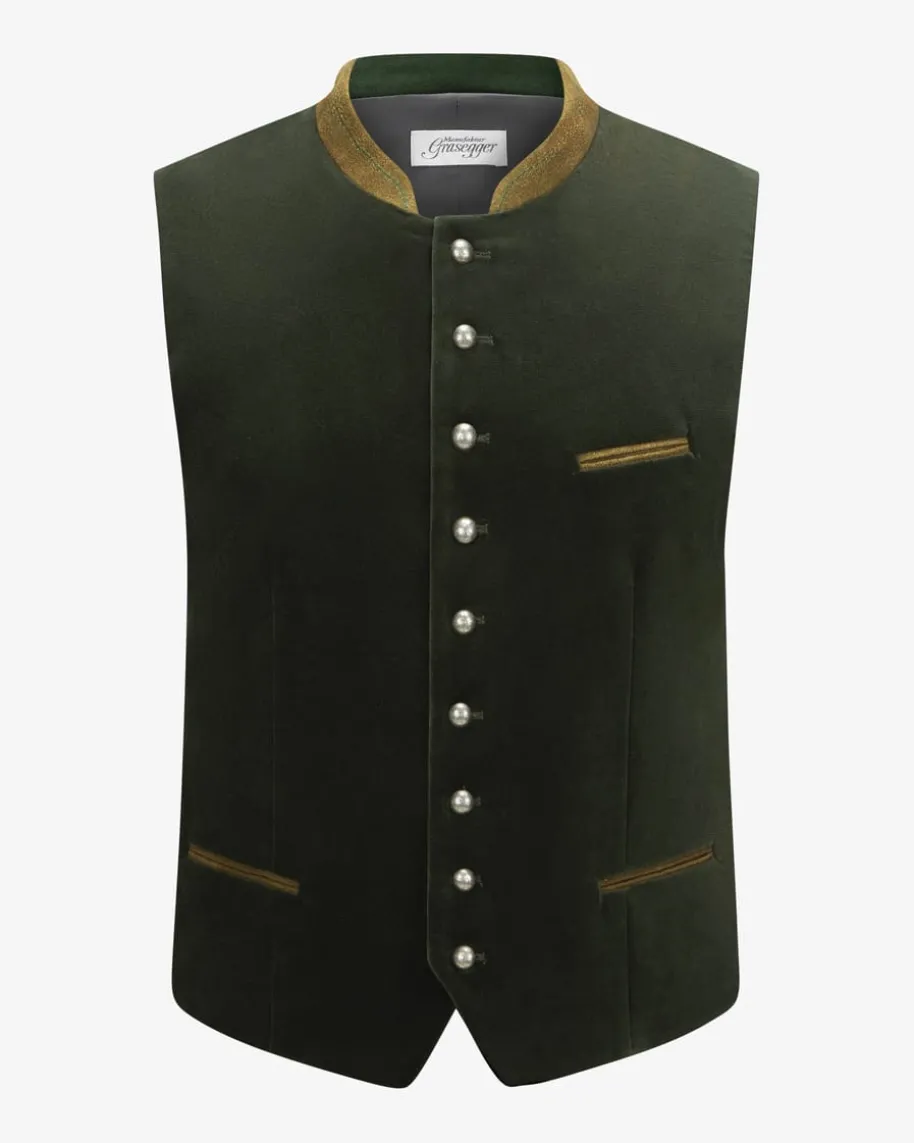 Aurach Samt-Trachtenweste für Herren von Grasegger Manufaktur in Dunkeloliv,Grün und Rot. Weicher Baumwoll-Samt auf der Vorderseite, der zeitlose Schnittsowie die filigranen Stickereien am Stehkragen machen die Weste zum stilsicherenBegleiter zur Lederhose. Die kontrastfarbene Rückseite aus changierendem Taftmit feinem Blättermuster verleihen dem Trachten-Look das gewisse Etwas.