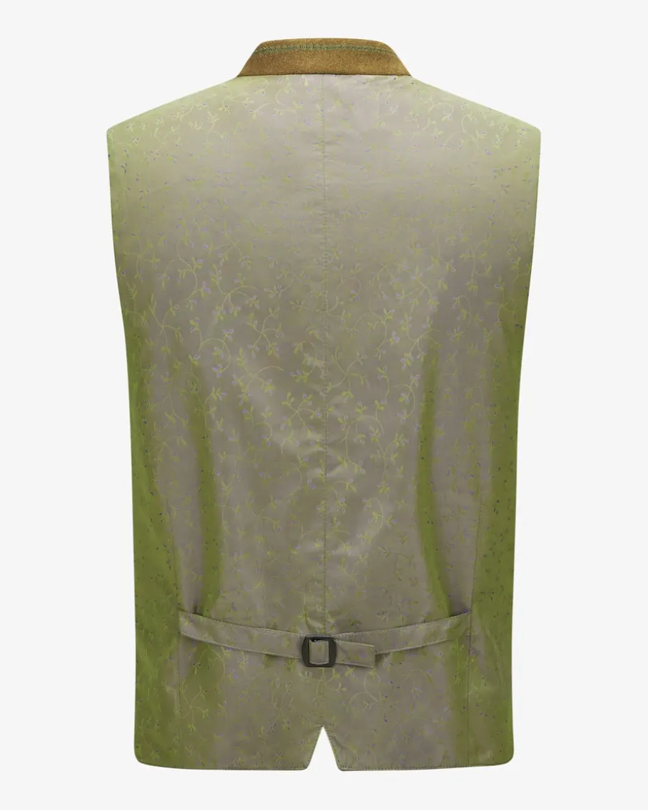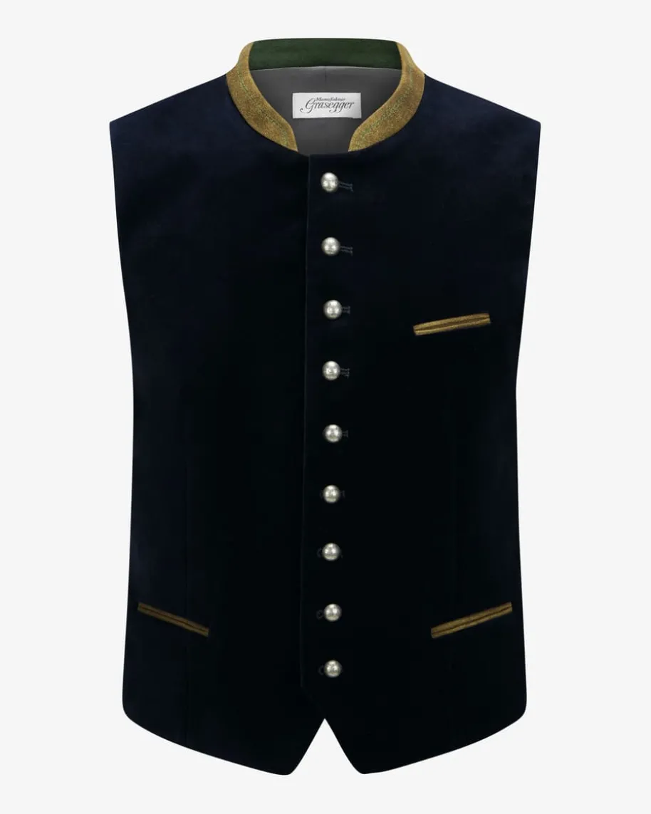 Aurach Samt-Trachtenweste für Herren von Grasegger Manufaktur in Dunkelblau,Grün und Violett. Weicher Baumwoll-Samt auf der Vorderseite, der zeitloseSchnitt sowie die filigranen Stickereien am Stehkragen machen die Weste zumstilsicheren Begleiter zur Lederhose. Die kontrastfarbene Rückseite auschangierendem Taft mit feinem Blättermuster verleihen dem Trachten-Look dasgewisse Etwas.