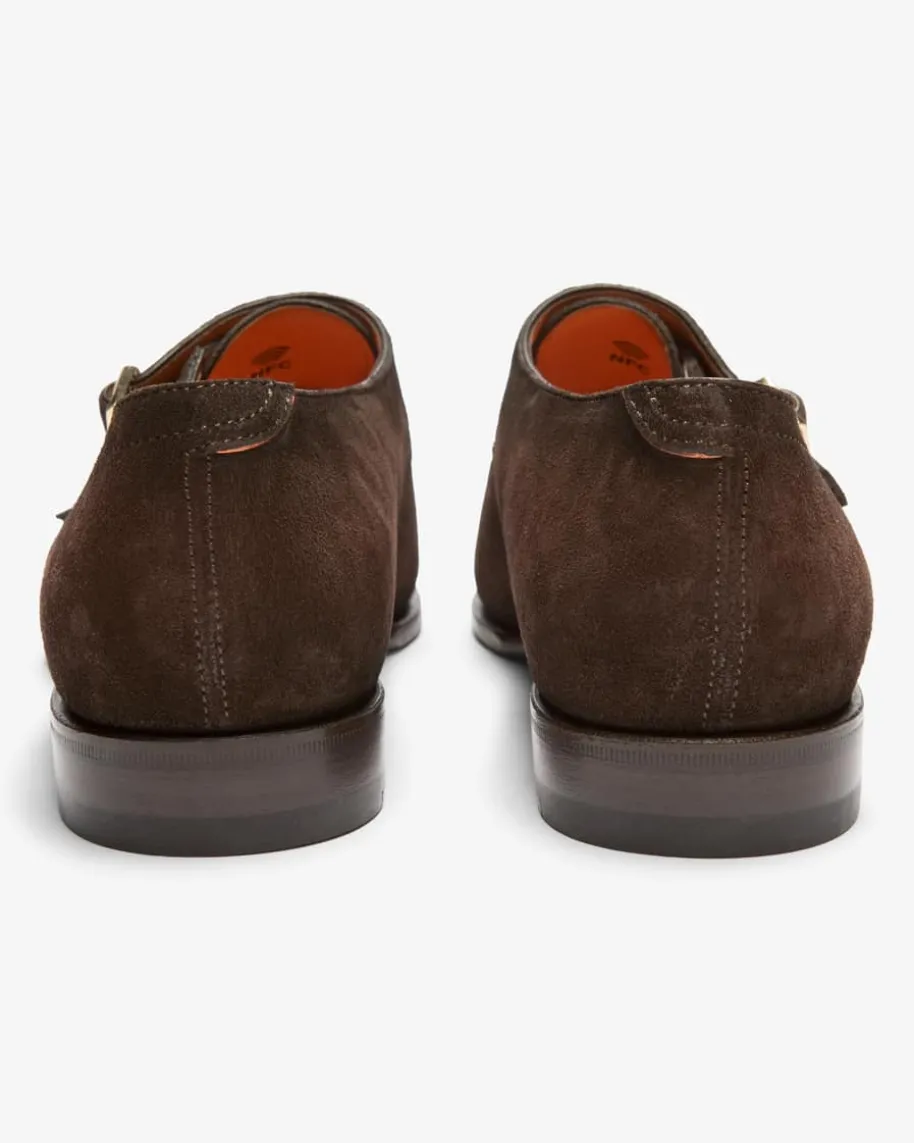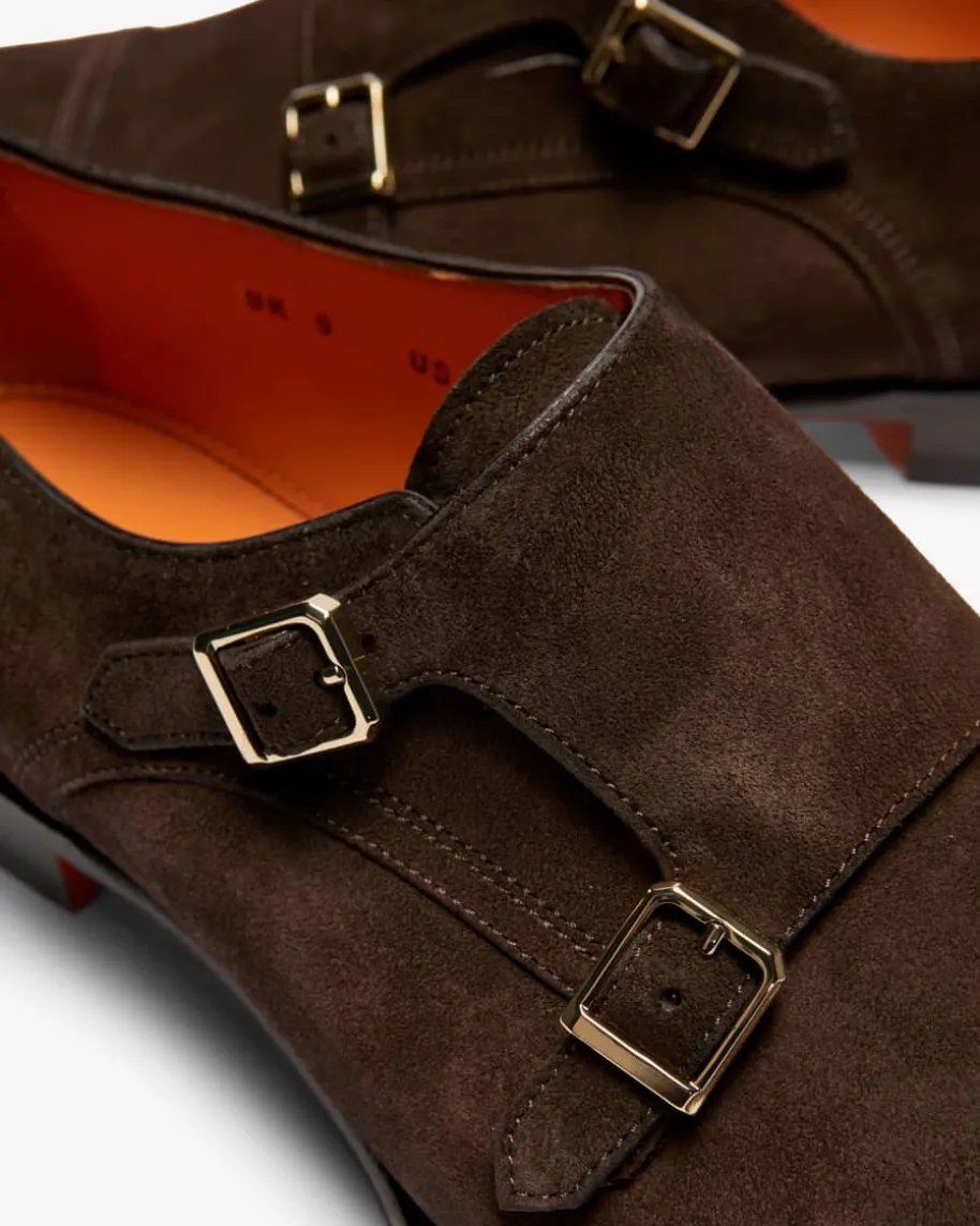 Axel-B Double-Monks für Herren von Santoni in Dunkelbraun. Die elegant-klassischen Double-Monks des italienischen Modelabels sind aus hochwertigemVeloursleder gefertigt, während die zwei charakteristischen Riemen mitgoldfarbenen Schließen den exklusiven und handgefertigten Herrenschuh maskulinin Szene setzen. Die Abnäher an der spitz zulaufenden Kappe runden den Schuhgekonnt ab.