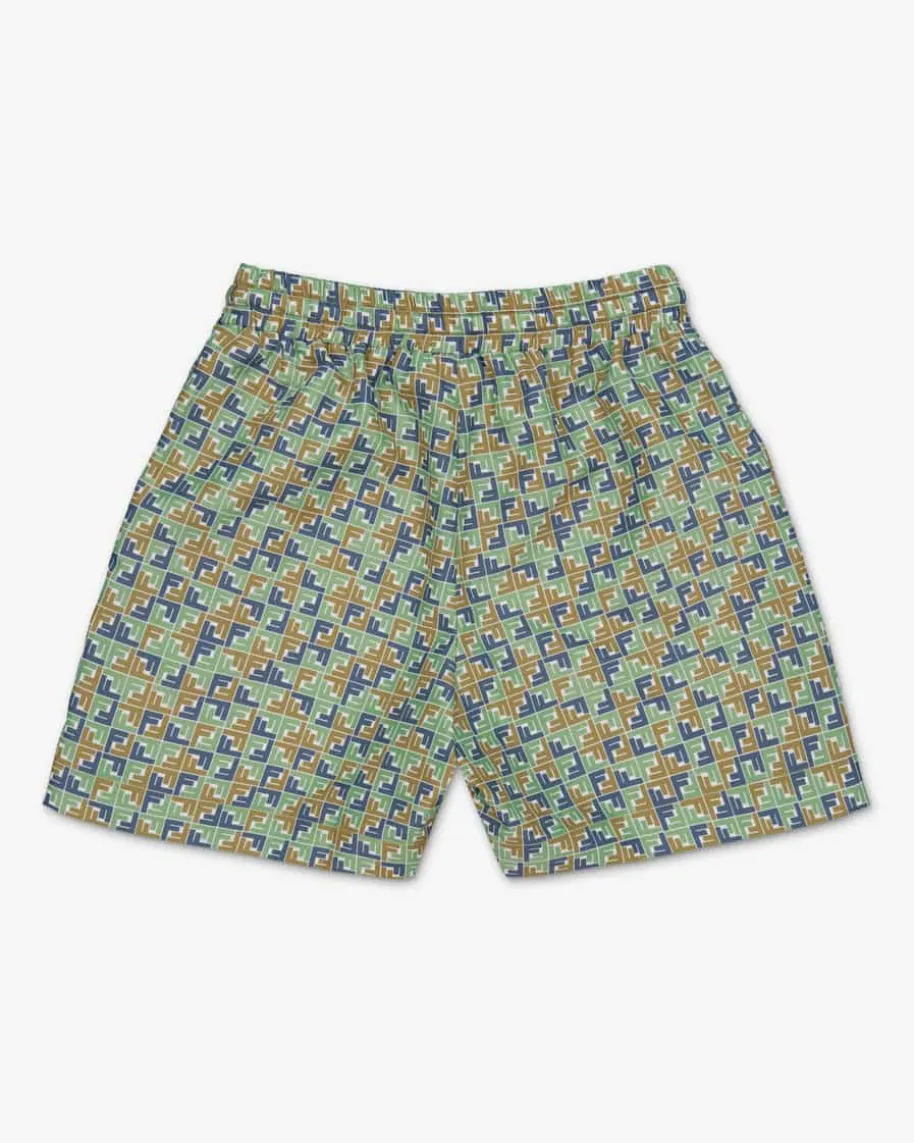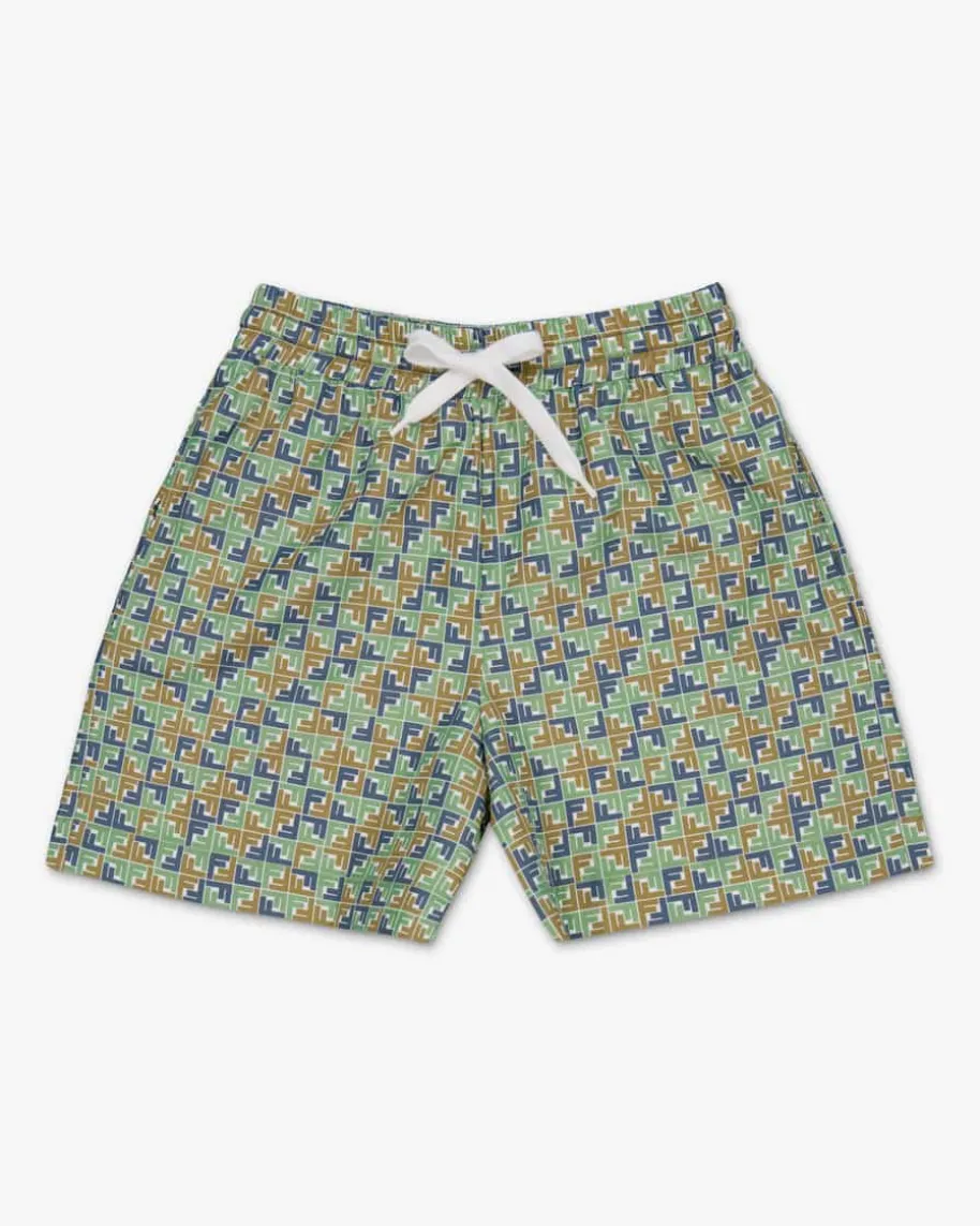 Badeshorts für Jungen von Fendi Kids in Grün, Navy und Ocker. Dieses Modellgarantiert dank elastischem Bund sowie legerer Schnittführung einen hohenTragekomfort, während das farbenfrohe Allover-Logo-Dessin für einen modischenund charakteristischen Touch sorgt.