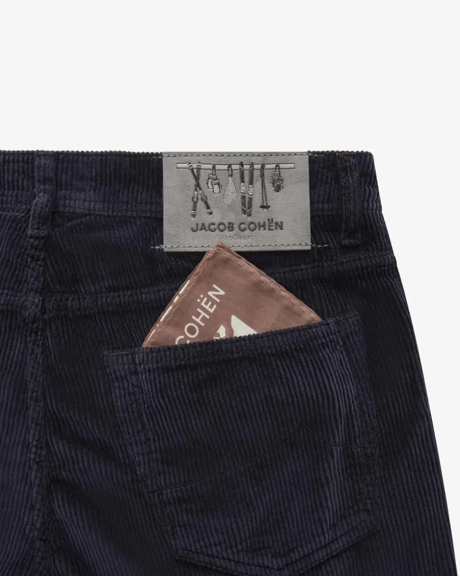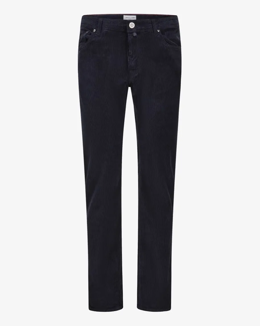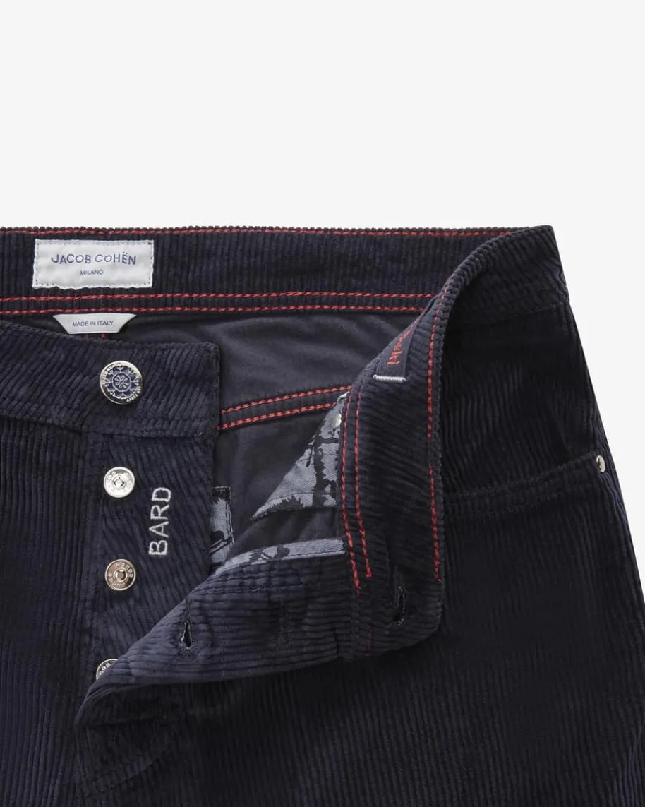 Bard Cordhose für Herren von Jacob Cohen in Navy. Stilvoll und zeitlos zugleichpräsentiert sich das Five-Pocket-Modell als vielseitig kombinierbarer Alltags-Favorit, der in keiner Garderobe fehlen darf.
