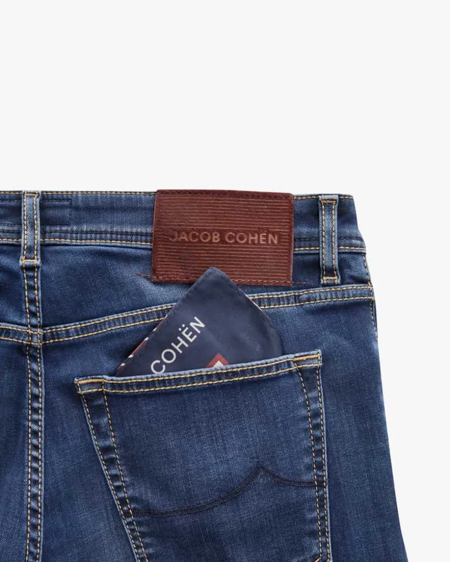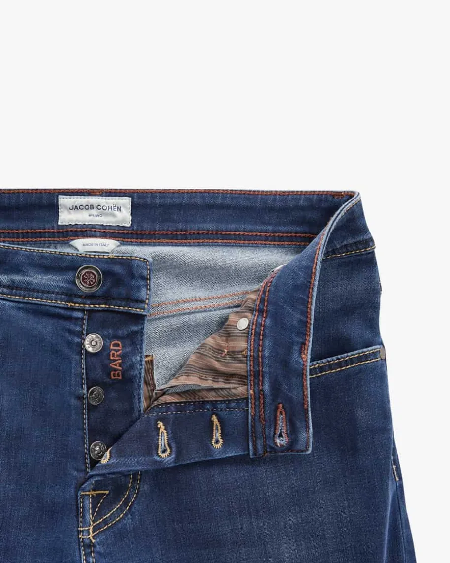 Bard Jeans Slim Fit für Herren von Jacob Cohen in Blau und Rot. Made in Italy -Dank hochwertigem und elastischem Baumwoll-Lyocell-Mix erhält das schmalgeschnittene Modell eine besonders softe Denim-Haptik und garantiert somithöchsten Tragekomfort, während die klassische Waschung in Kombination mitlabeltypischen Details einen zeitlosen Alltags-Favoriten schafft.
