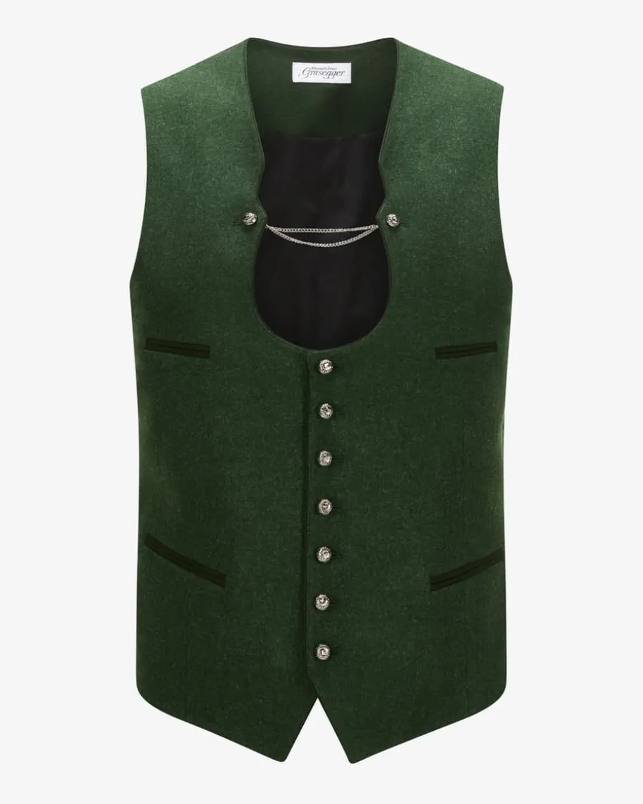 Batzen Trachtenweste für Herren von Grasegger Manufaktur in Grün und Schwarz.Das Modell präsentiert sich dank dem hochwertigen Schurwoll-Mix sowie edlerKugel-Knöpfe in traditioneller Aufmachung und erweist sich als stilvollerBegleiter für maskuline Trachten-Looks.