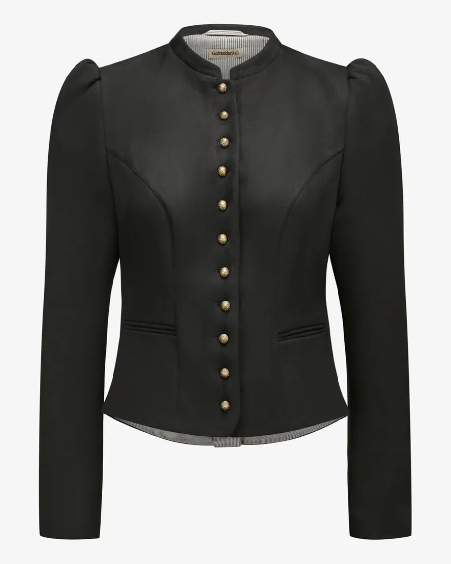 Belinda Trachtenblazer für Damen von Gottseidank in Schwarz. Das taillierteModell besticht in hochwertigem Material-Mix, während die Puffärmel und dasSchößchen das feminine Gesamtbild modern abrunden und so einen klassischenTrachten-Begleiter kreieren.