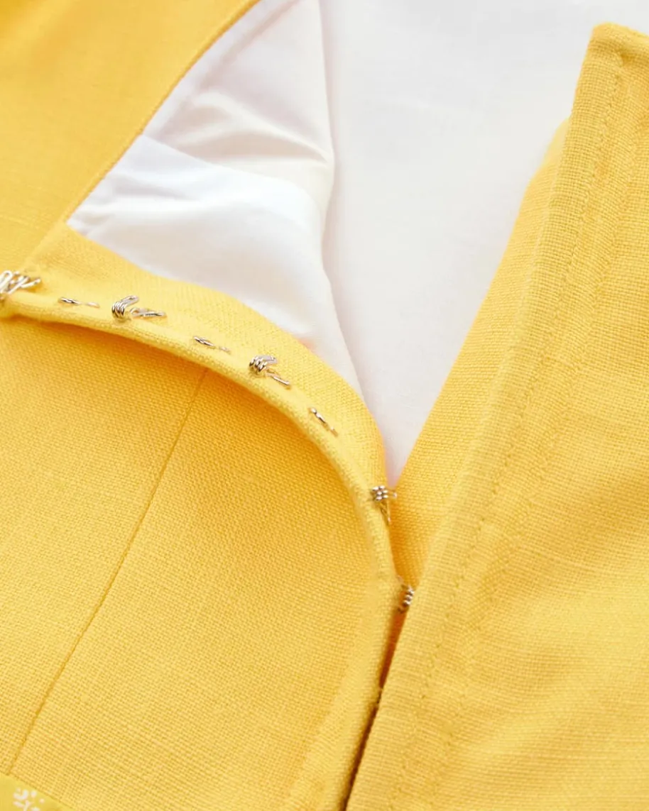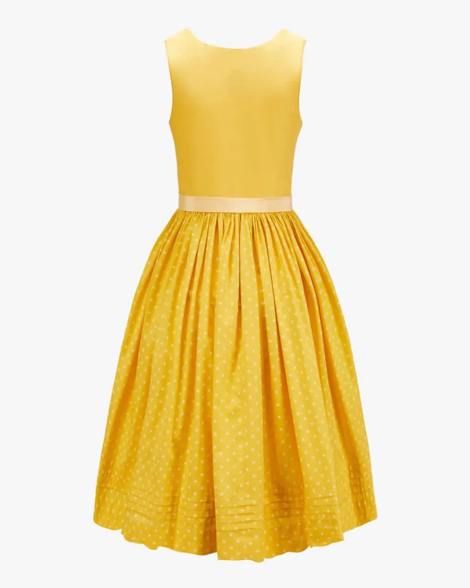 Bette Midi-Dirndl mit Seidenschürze für Damen von Tostmann in Gelb. Trachten-Handwerk aus Österreich – Das tradtitionelle Modell überzeugt durch den mitfloralem Print gemusterten Rock und klassischen Details, während diestrukturierte Leinen-Qualität im Mieder für angenehmen Tragekomfort sorgt. Diechangierende Seiden-Schürze rundet den Trachten-Look feminin ab.