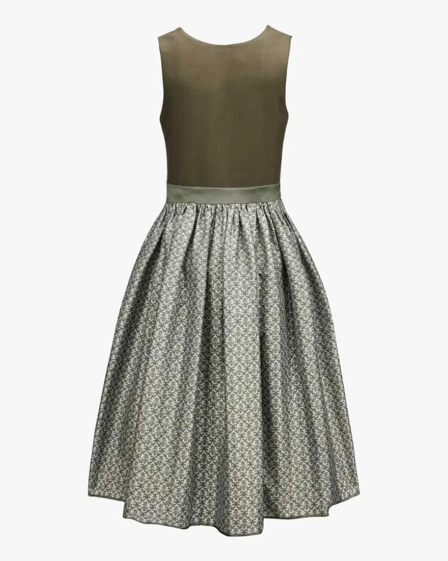 Bette Midi-Dirndl mit Seidenschürze für Damen von Tostmann in Oliv und Salbei.Trachten-Handwerk aus Österreich – Das Modell überzeugt durch den mit feinenOrnamenten gemusterten Rock und klassische Details, während die strukturierteLeinen-Qualität im Mieder für angenehmen Tragekomfort sorgt. Die Schürze auschangierender Seide rundet den Trachten-Look feminin ab.
