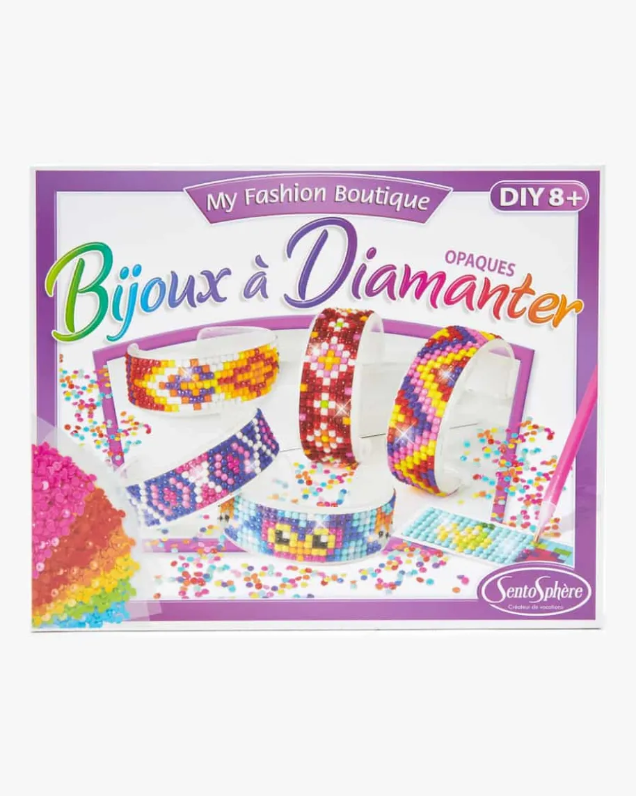 Bijoux à Diamanter Kreativ-Set für Kinder von SentoSphere in Bunt. Ein kreativesSchmuckset mit dem ihre Kinder glitzernde Armreifen selbst gestalten können.Durch das Anbringen bunter Strasssteine auf den vorgedruckten Motivvorlagenkönnen ihre Kleinen ihren ganz individuellen Schmuck mit verschiedenen Musternund Motiven herstellen.