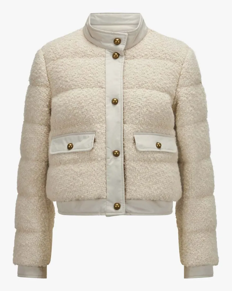 Blandy Daunenjacke für Damen von Moncler in Creme. Für hochwertigeDaunenjacken ist das italienische Label weltweit bekannt. Auch dieses Modell inweiter, verkürzter Passform verspricht dank der hochwertigen Daunen-Feder-Füllung eine leichte Wärmeisolierung, während das Bouclé-Design in Kombinationmit den Kugelknöpfen einen modischen Begleiter schafft.