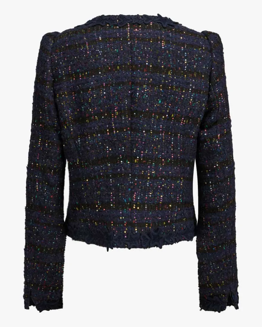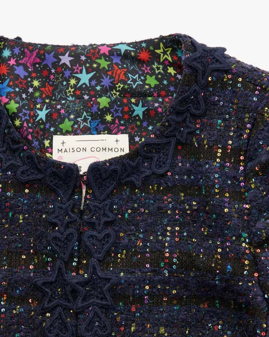 Blazer für Damen von Maison Common in Navy, Schwarz und Bunt. Der kastigeKurzblazer überzeugt mit edler Tweed-Optik aus angenehmer Woll-Mischung, währenddie bunten Pailletten und die originelle Spitzen-Borte verspielte Akzentesetzen. Das farbenfrohe Innenfutter mit Sternen-Muster verleiht den letztenSchliff.
