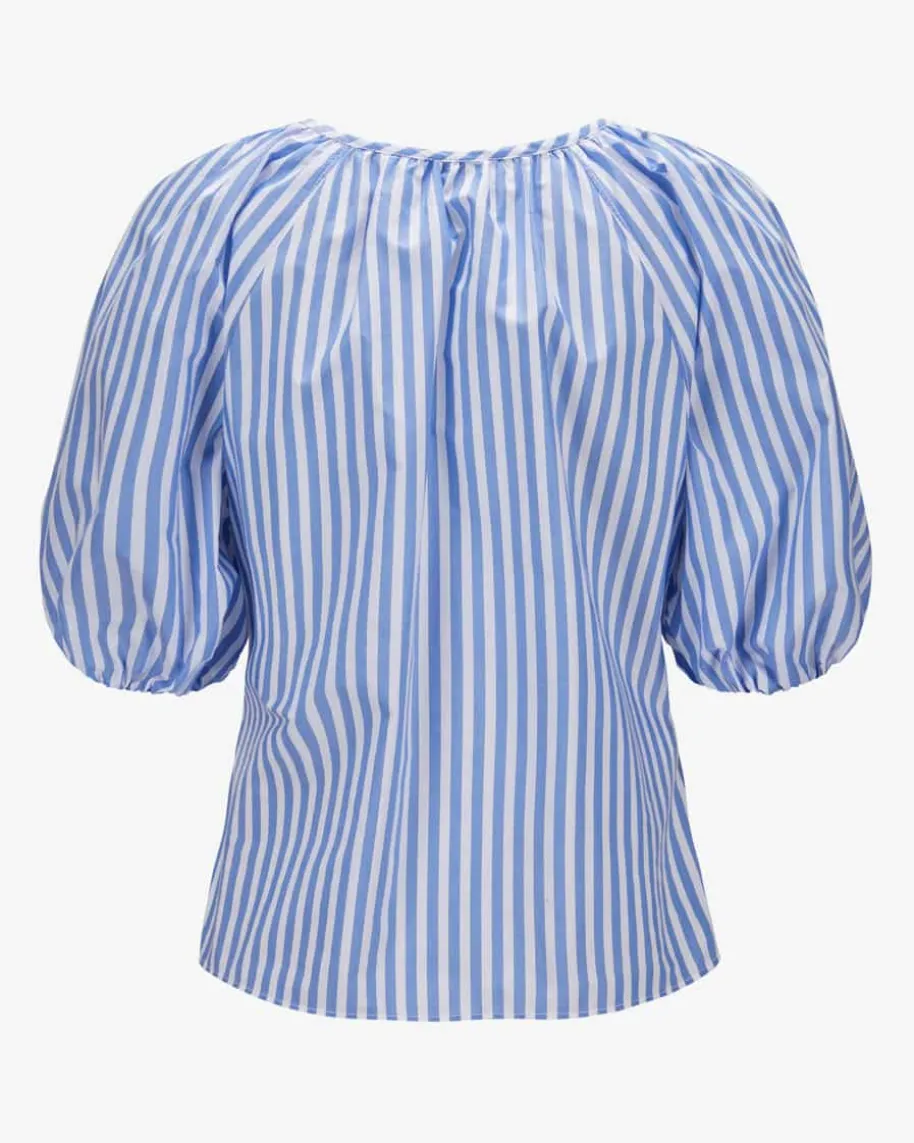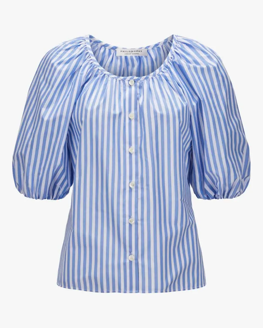 Bluse für Damen von Philosophy in Hellblau und Weiß. Feminine Leichtigkeit mitsinnlich-eleganter Note – Das verkörpert das Label mit ihrer innovativenAnlassmode. Das Modell präsentiert sich dank der ballonartigen Puffärmel infemininer Aufmachung, welche durch das Streifenmuster modern ergänzt wird.