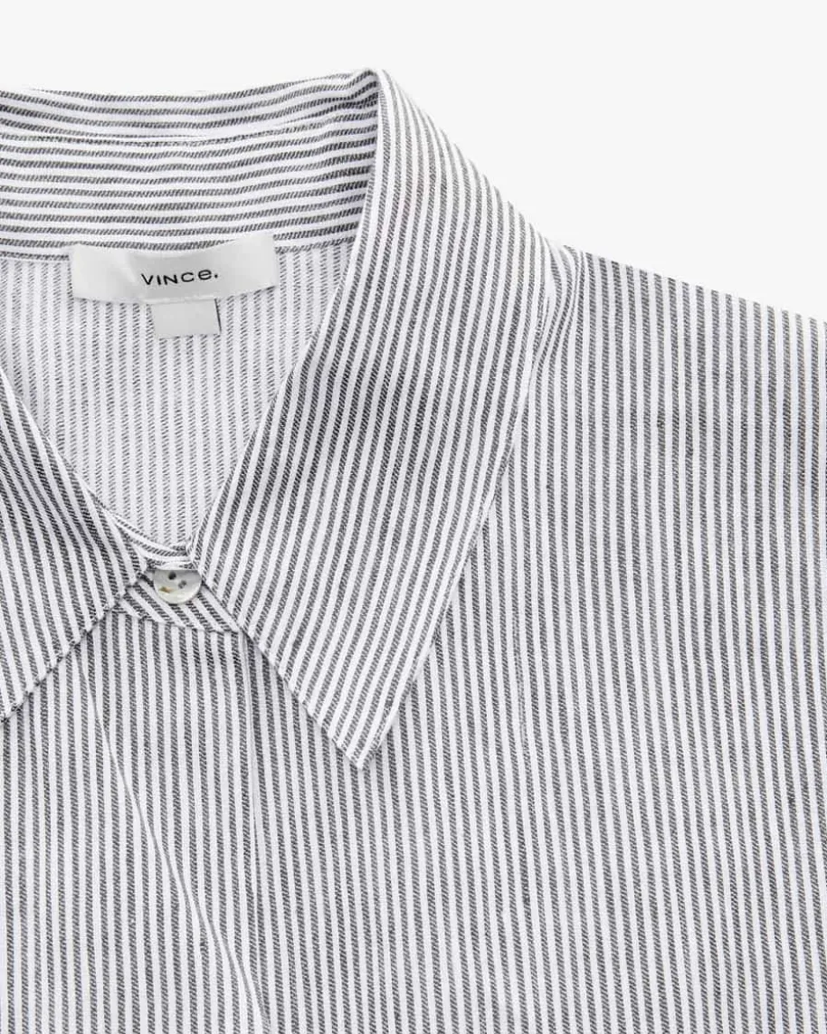 Bluse für Damen von Vince in Anthrazit und Weiß. Das Modell überzeugt mitklassischer Hemdblusen-Aufmachung, während das rückseitige Detail in Tunnelzug-Optik ein raffiniertes Highlight setzt. Das Streifen-Dessin vollendet den Lookzusammen mit den Knöpfen in Perlmutt-Optik harmonisch.