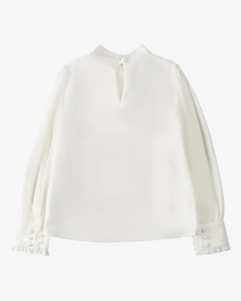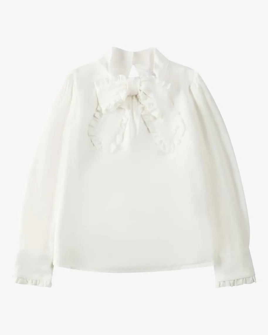 Bluse für Mädchen von Patachou in Weiß. Das semitransparente Modell präsentiertsich dank der fließenden Material-Qualität in in eleganter Aufmachung, währenddie Schleife am Kragen sowie Rüschen-Details ein niedliches Gesamtbild schaffen.