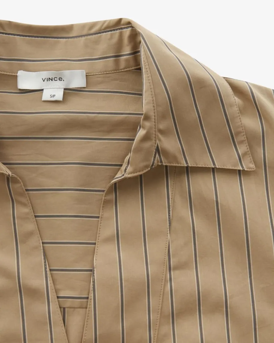 Bluse für Damen von Vince in Sand, Dunkelgrau und Creme. Das Label steht fürkalifornisch inspirierte Mode mit mühelosem Stil – raffinierte, unkomplizierteTeile mit besonderer Leichtigkeit. Auch dieses Modell punktet mit leichterBaumwoll-Qualität und feinem Streifenmuster, während der geschlitzte Ausschnittmit Umlegekragen das stilvolle Modell gekonnt abrundet.