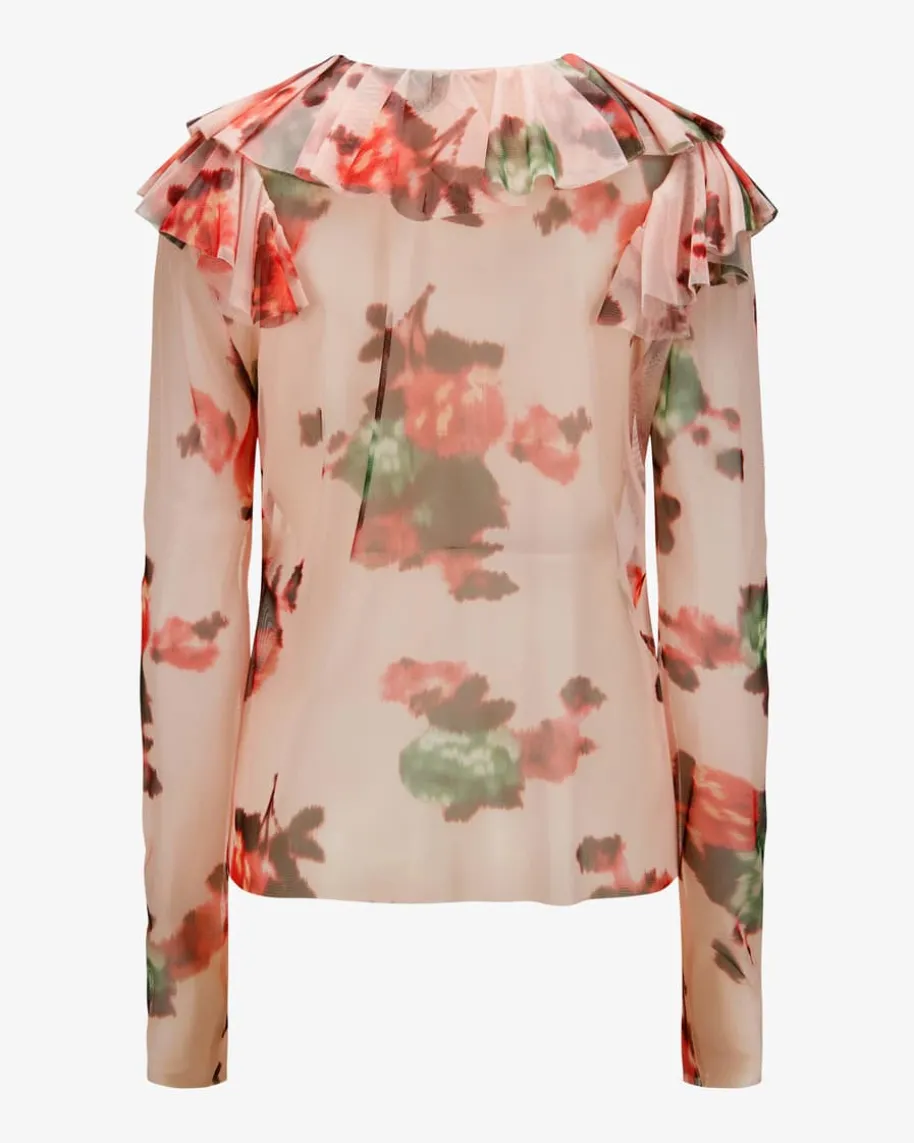 Bluse für Damen von Philosophy in Rosé, Rot und Dunkelgrün. FeminineLeichtigkeit mit sinnlich-eleganter Note – Das verkörpert das Label mit ihrerinnovativen Anlassmode. Das Modell präsentiert sich in semitransparenter Mesh-Aufmachung, welche durch das Blumenmuster stilvoll ergänzt wird. Zugleich setzendie Volants-Details entlang des Ausschnitts besondere Akzente.