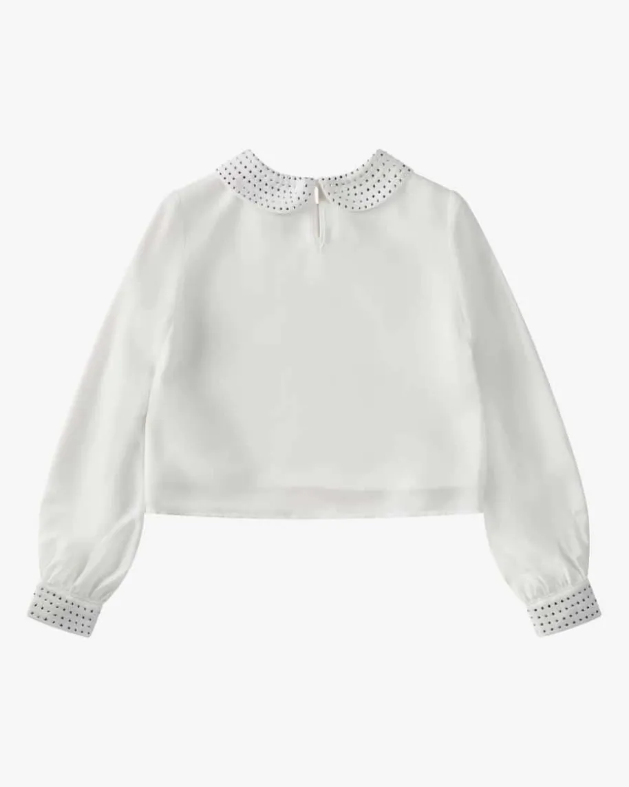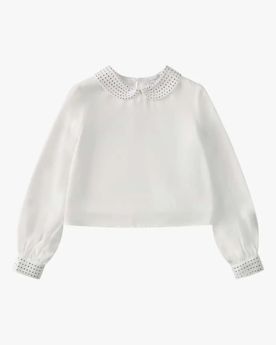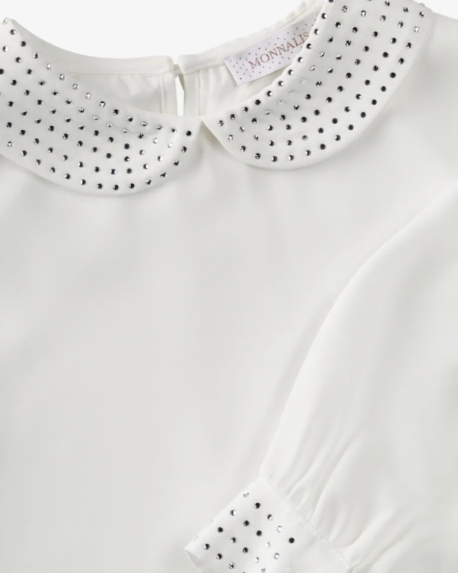 Bluse für Mädchen von Monnalisa in Weiß und Silber. Das Modell in fließenderMaterial-Qualität, sorgt dank silberfarbenem Schmucksteinbesatz für einenbesonderen Begleiter der sich vielseitig stylen lässt.