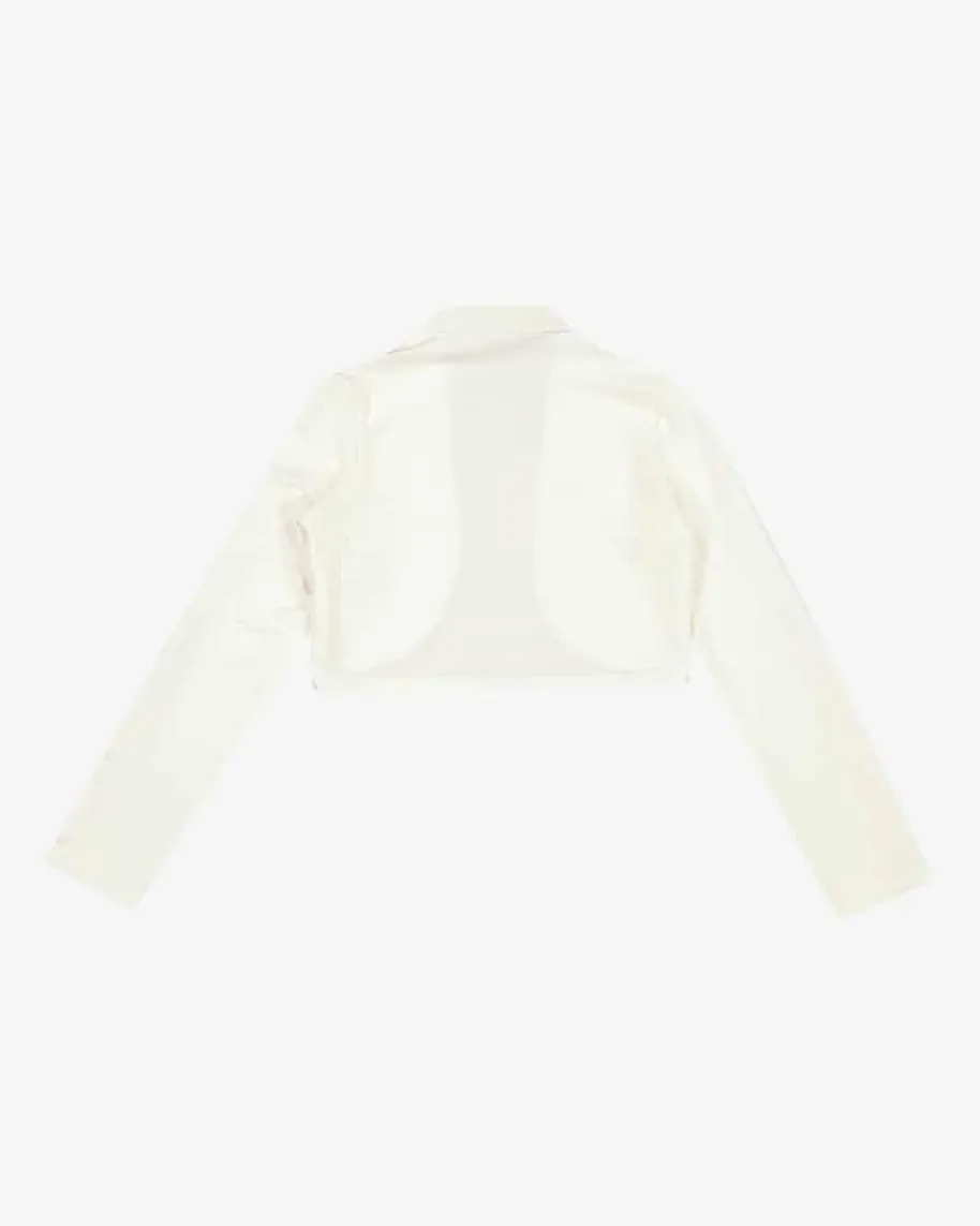 Bolero für Mädchen von Weise in Creme. Das Modell begeistert dank schlichterAufmachung als perfekter Begleiter bei festlichen Anlässen. Zusätzlich verleihtdie Blüten-Applikation dem Gesamtbild einen niedlichen Touch. Kann idealerweisezu einem Kommunionskleid getragen werden.