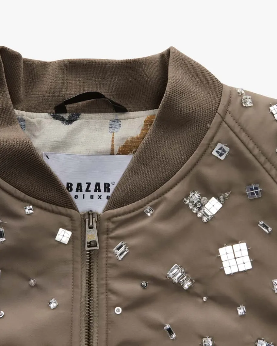 Bomberjacke für Damen von Bazar Deluxe in Taupe. Das Modellbegeistert mitextravaganten Schmuckstein-Applikationen und changierenderMaterial-Verarbeitung. Die sportive Silhouette mitRippstrick-Bündchen und Raglanärmelnrundet den modischen Look gekonnt ab.