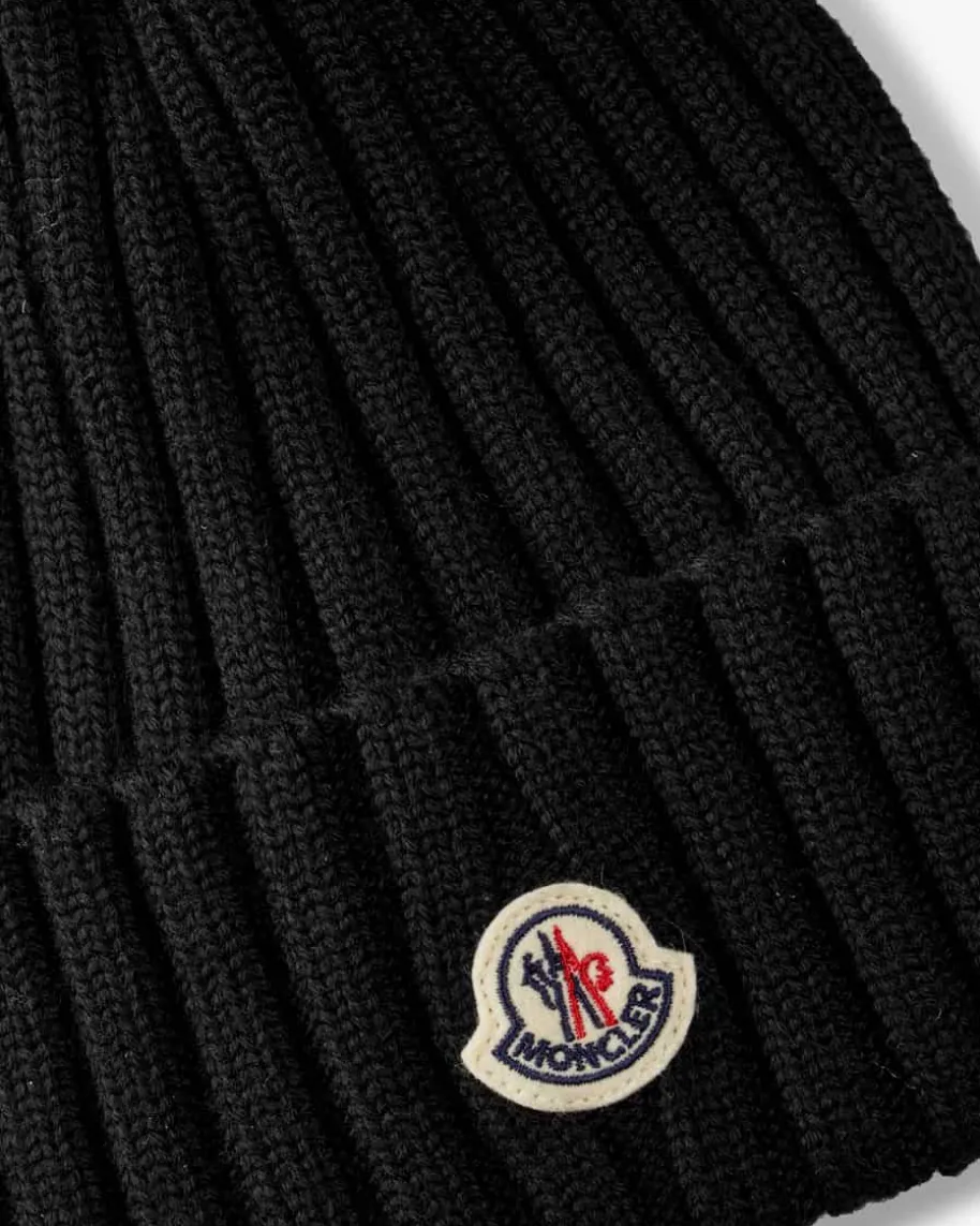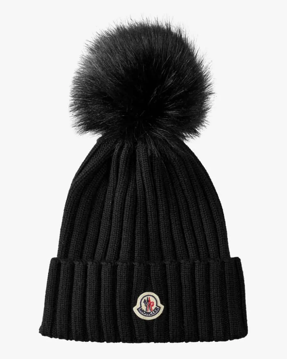 Bommel-Mütze für Damen von Moncler in Schwarz. Das Modell aus angenehmerSchurwolle avanciert durch sein grobes Rippstrick-Design zum modernen Begleiterfür den Winter, welchem der Kunstfell-Bommel den letzten Schliff verleiht.
