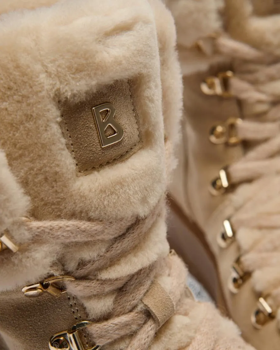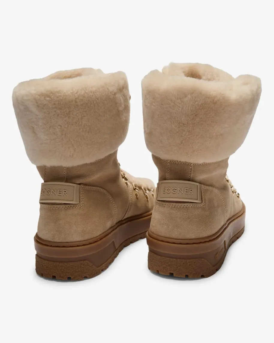 Boots für Damen von Bogner in Sand. Das Modell zeichnet sich durch diehochwertige Veloursleder-Qualität mit weichem und glatten Lammfellfutter aus,wodurch ein wärmender und zugleich moderner Begleiter im Equestrian-Stilentsteht. Zudem runden die dezent goldenen Metallösen sowie Logo-Details denLook im edlen Stil ab. Ein weiteres Highlight ist das in der Sohle integrierteAnti-Rutsch-System, das je nach Bedarf aktiviert werden kann.
