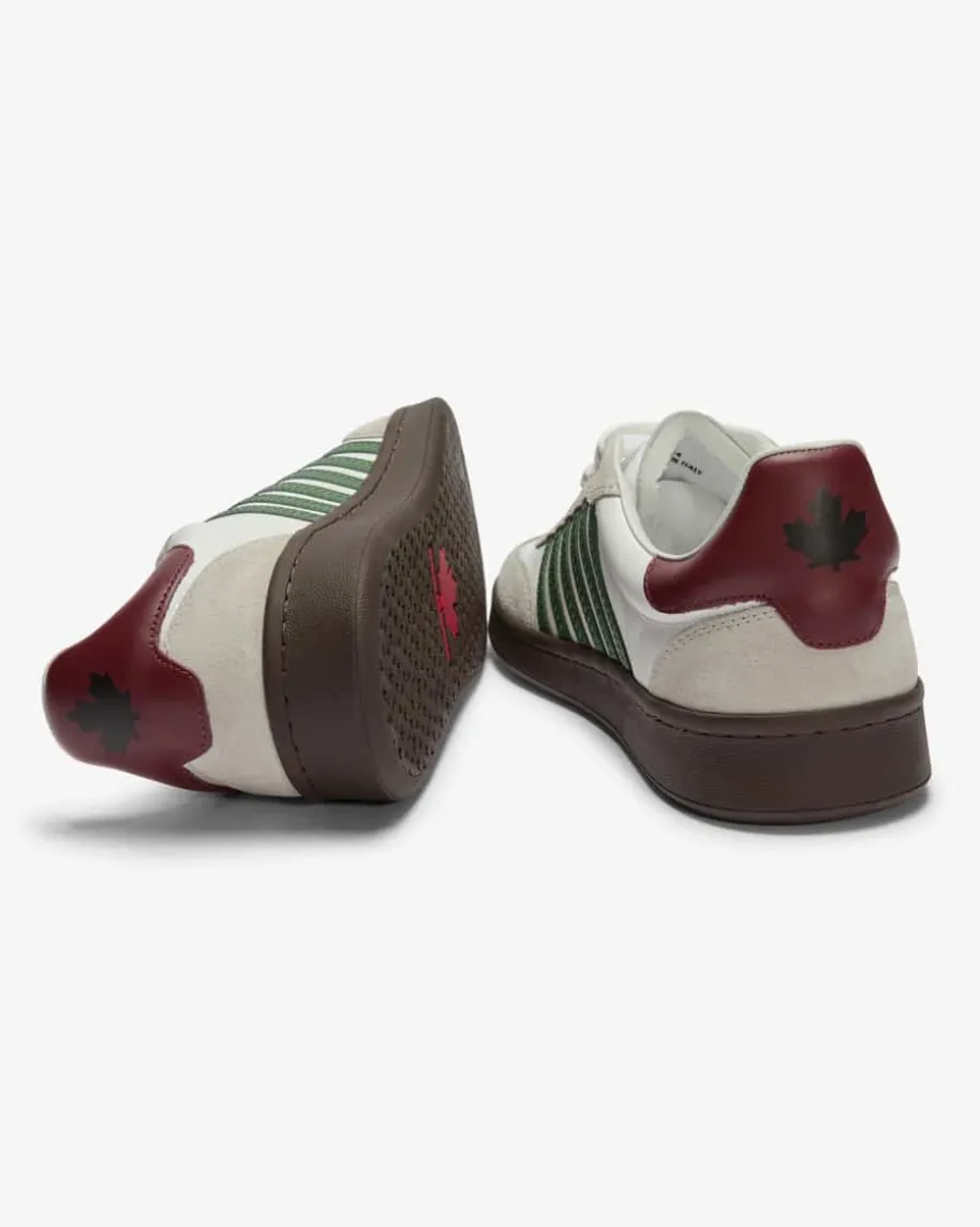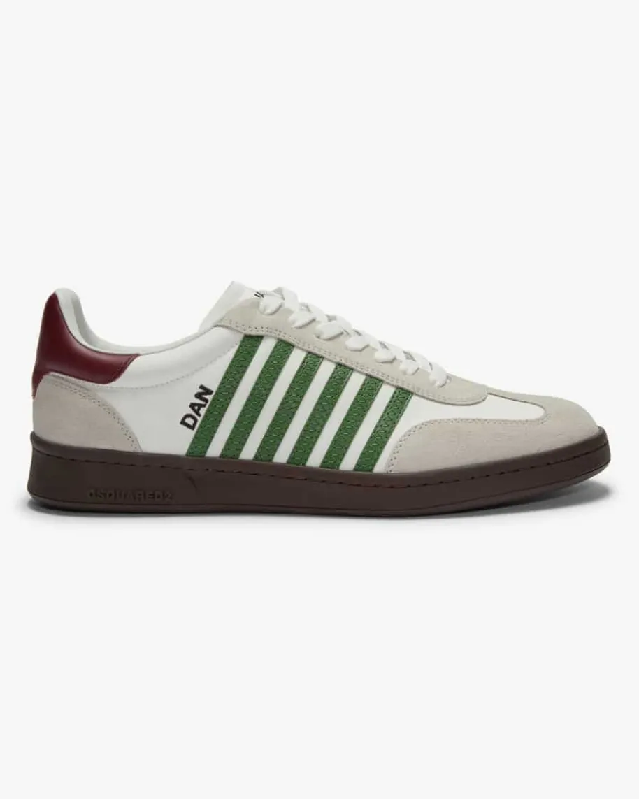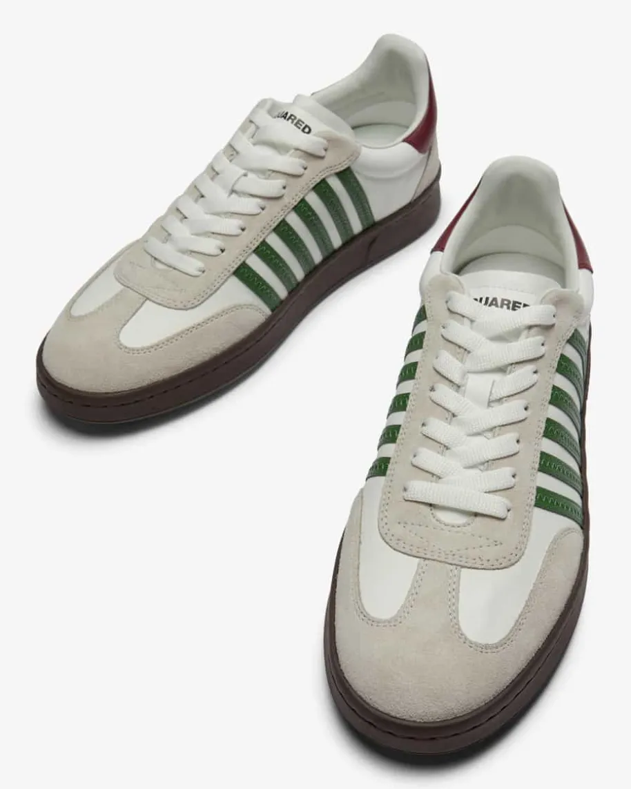 Boxer Sneaker für Herren von Dsquared in Weiß, Stein und Grün. Die Handschriftdes Duos ist ein Mix aus dem American Dream, kombiniert mit ihren italienischenWurzeln und dem italienischen Schneiderhandwerk, sowie viel Liebe zum Detail undzum Außergewöhnlichen. Auch mit diesem Modell präsentiert das Label einensportiven Favoriten, der dank hochwertigen Veloursleder-Details zum modischenBlickfang mit Retro-Charakter avanciert.