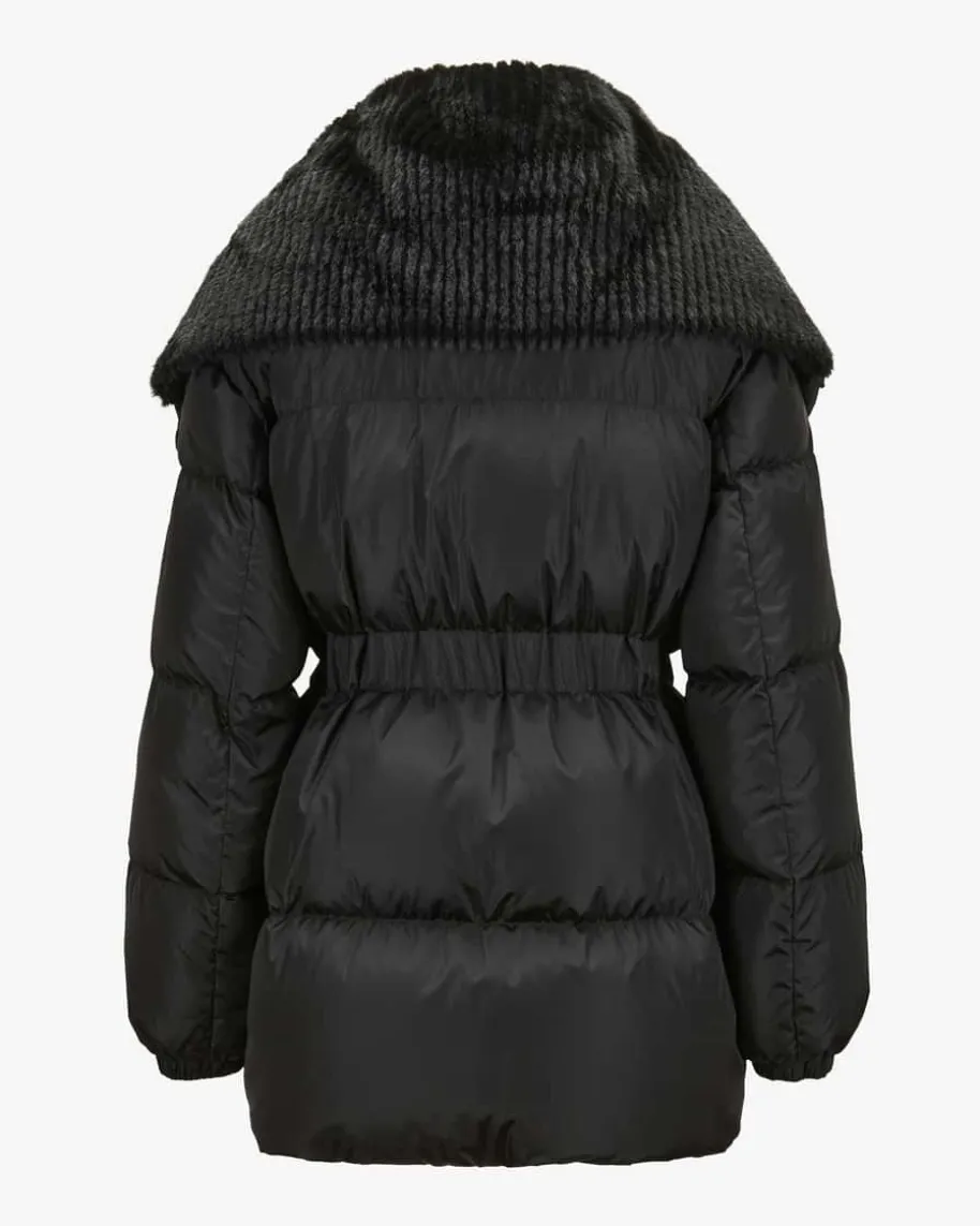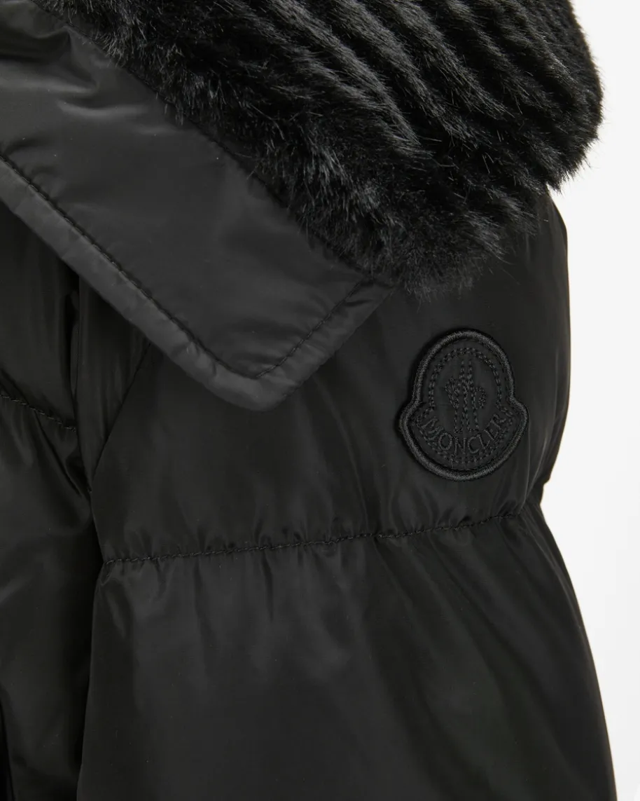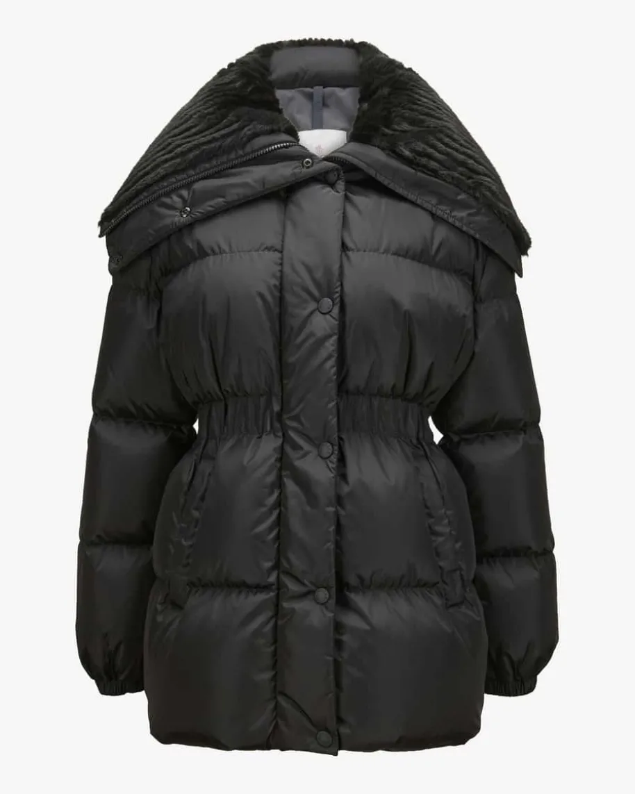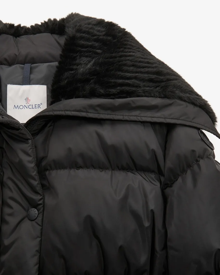 Brasseurs Daunenjacke für Damen von Moncler in Schwarz. Das Modell präsentiertsich dank des taillierten Schnittes in femininer Aufmachung, während diechangierende Stepp- Optik mit optimal isolierender Daunen-Feder-Füllung höchstenKomfort verspricht. Der breite Kragen punktet als Blickfang dank der Teddyfell-Innenseite.