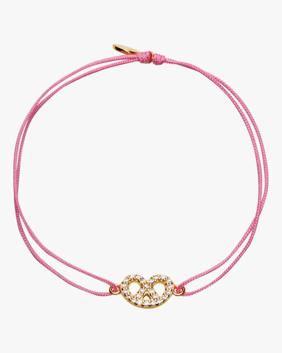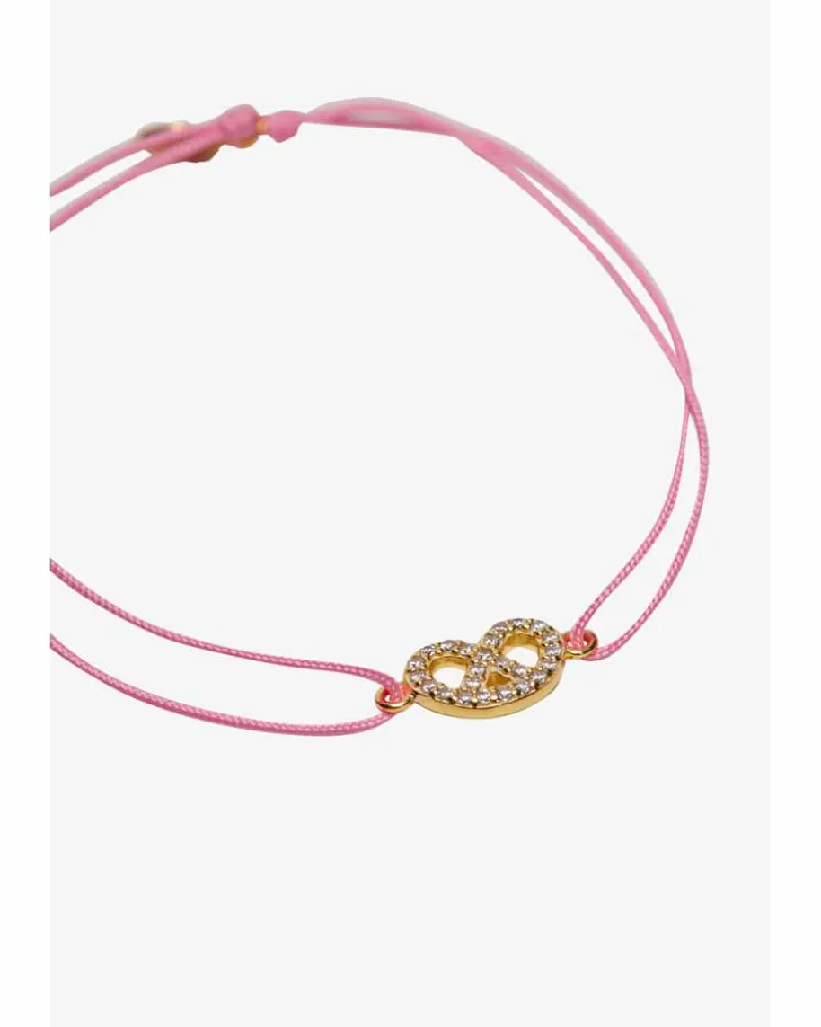 Brezn Zirkoni Glücksbändchen für Damen von Leaf in Gold und Rosa. Dank dervergoldeten Brezel mit Zirkonia-Besatz präsentiert sich das Modell als modischesAccessoire für stilbewusste Damen, während das verstellbare Bändchen denperfekten Sitz verspricht.