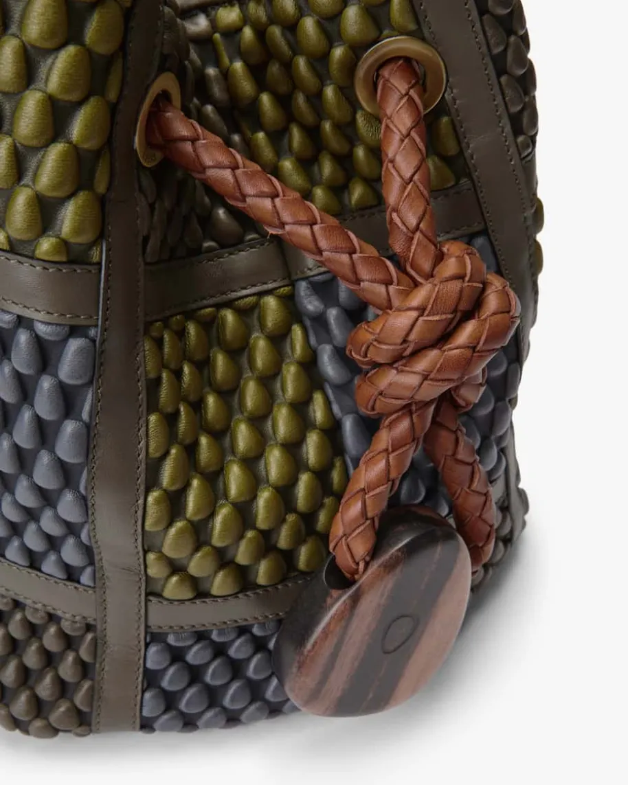 Bucket Bag Small Henkeltasche für Damen von Tissa Fontaneda in Khaki, Blauund Cognac. Das 2010 gegründete Label vereint Handwerkliches Können und Liebezum Detail. Die sofort erkennbare „Bubble Bag“ ist zum Markenzeichen derKollektion Tissa Fontaneda geworden. Auch dieses exklusive Modell begeistert incharakteristischer Aufmachung mit strukturierter Optik, wobei das stilvollePatchwork-Design das gewisse Etwas verleiht.