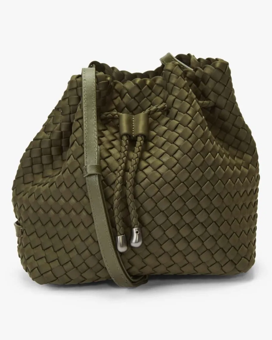 Gramercy Medium Bucket Umhängetasche für Damen von Naghedi in Oliv. Diesestextile Modell präsentiert sich in dezent changierender Optik und edler Flecht-Aufmachung, während das Bucket-Design mit Kordelzug-Verschluss einen modischenBegleiter kreiert.
