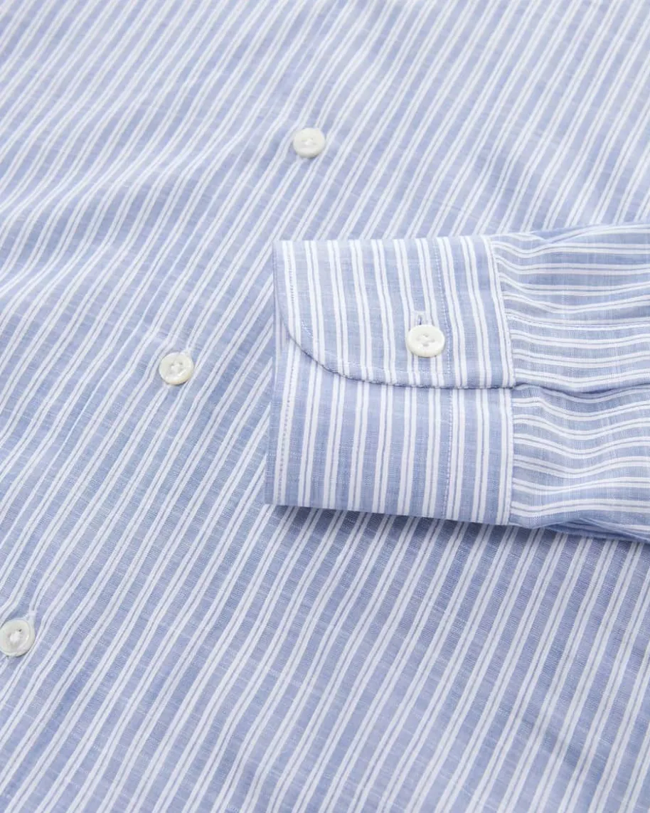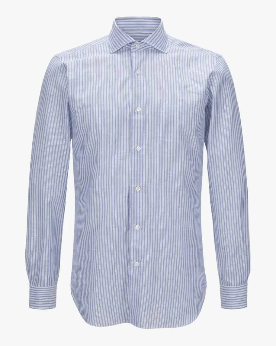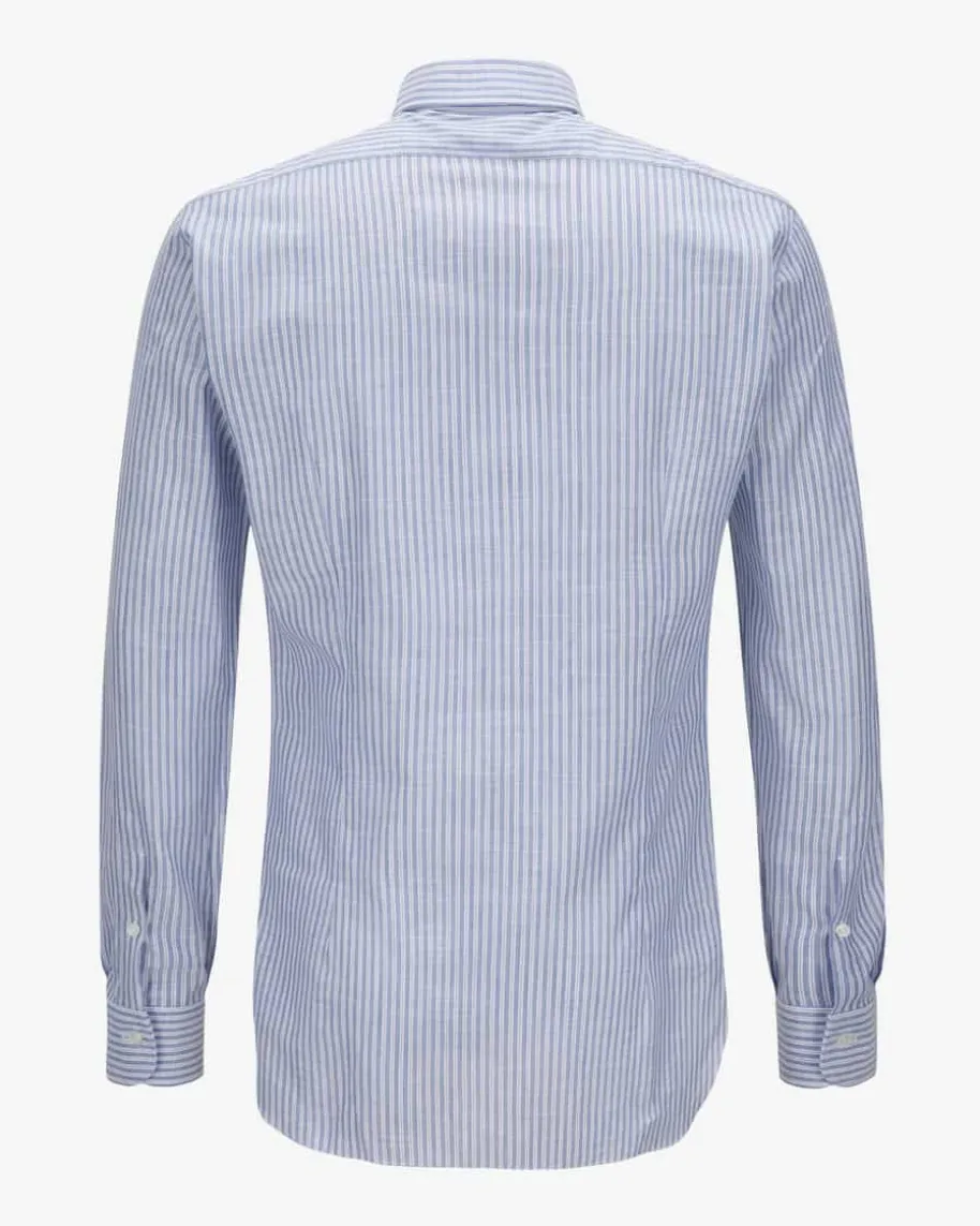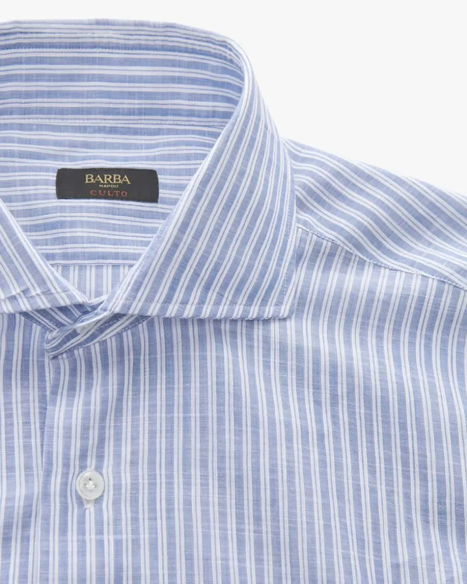 Businesshemd für Herren von Barba in Blau und Weiß. Das Modell der Culto-Liniepräsentiert sich dank hochwertigem Baumwoll-Leinen-Mix mit angenehm-leichterHaptik, während das modische Streifen-Dessin einen stilsicheren Favoriten fürIhre Office-Garderobe kreiert.