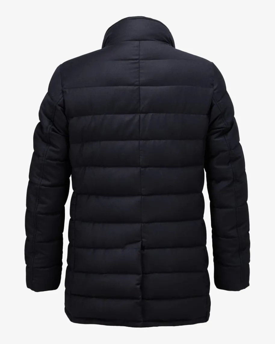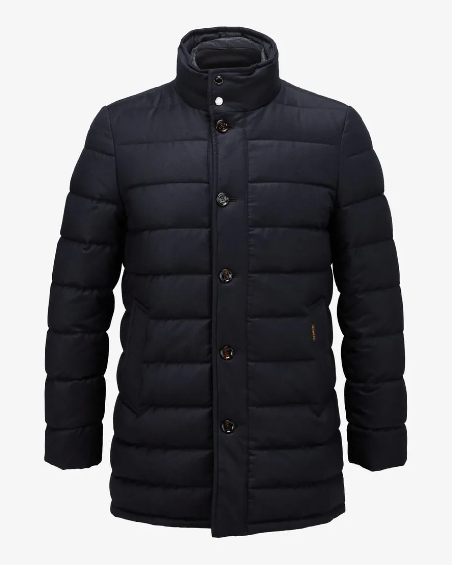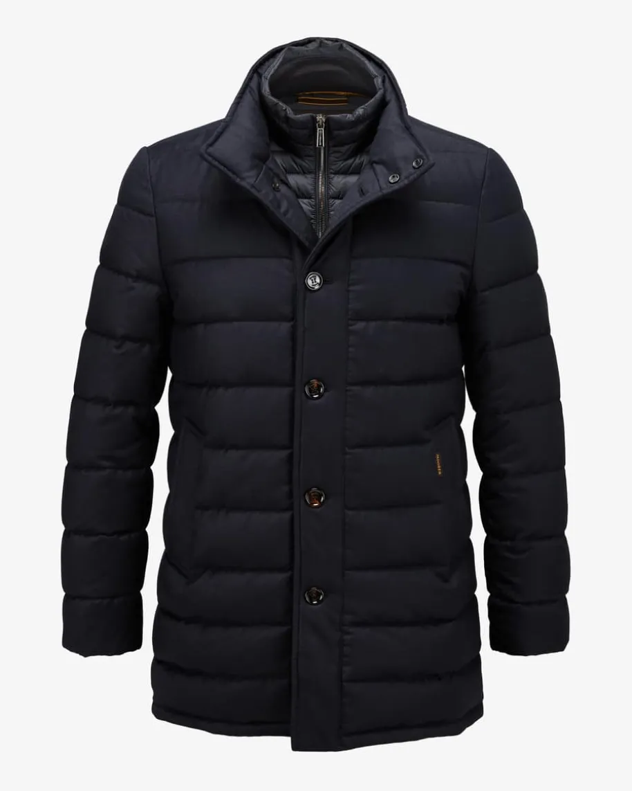 Calegari Daunenjacke für Herren von Moorer in Navy. Made in Italy – Das imNorden Italiens ansässige Label steht für hochwertige Jacken, gefertigt ausfeinsten Materialien und jedes Design steht für den klassischen Mode-CharmeItaliens. Auch dieses gesteppte Modell vereint maskulinen Charme mitfunktionalen Eigenschaften. Während der hochwertige Schurwoll-Cashmere-Mix fürein edles Finish sorgt, bietet die wärmeisolierende Daunen-Feder-Füllungoptimalen Schutz vor Kälte. Feine Logo-Knöpfe runden das Gesamtbild zudemstilvoll ab.