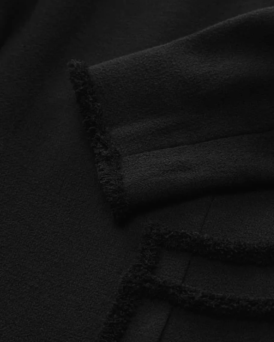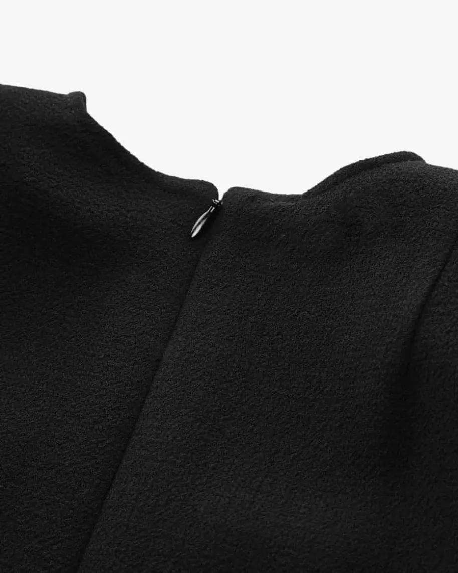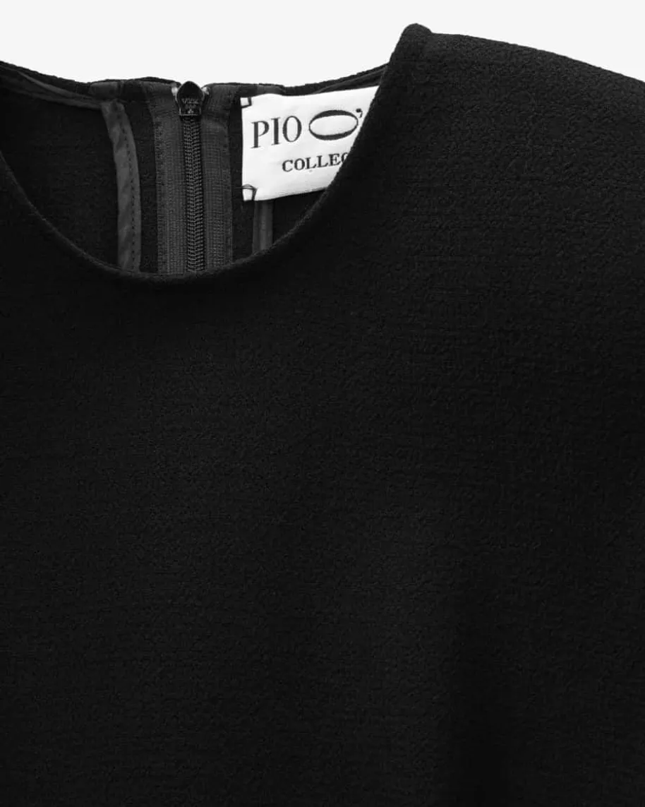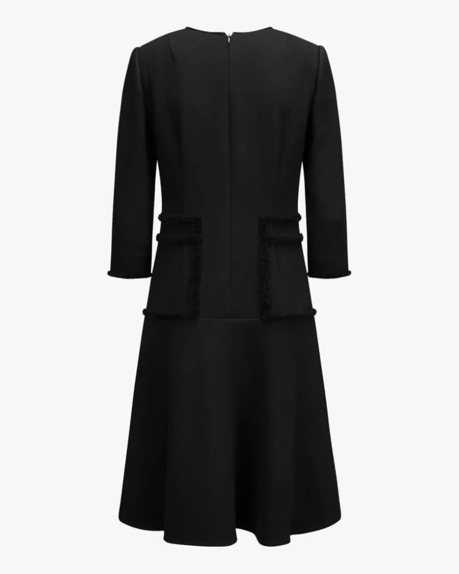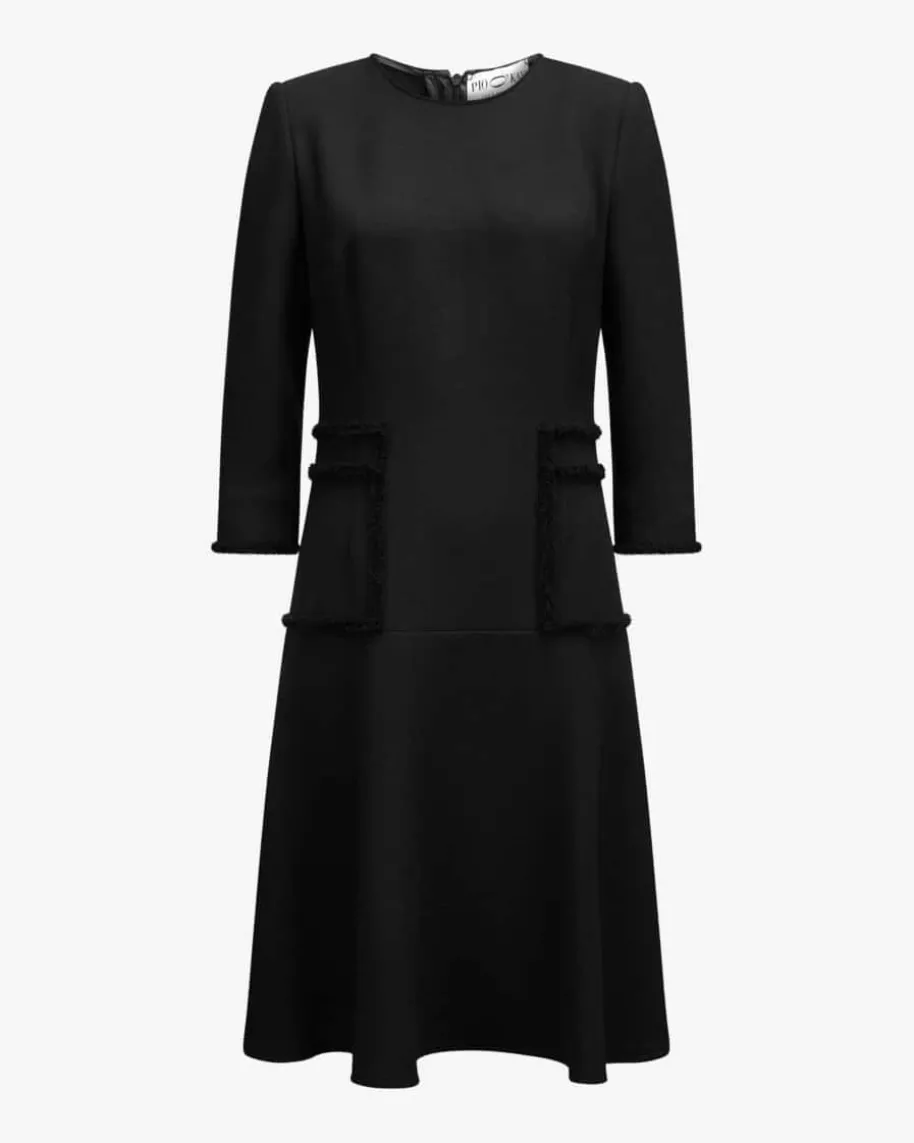Calla Kleid für Damen von Pio O’Kan in Schwarz. Zeitloser Luxus und moderneEleganz prägen den Stil dieses Modells – Die taillierte Silhouette und derausgestellte Rock garantieren femininen Schwung, während die feste Double-Crepe-Qualität und tonige Fransenborten einen modernen Begleiter mit 50er Jahre Touchkreiert.