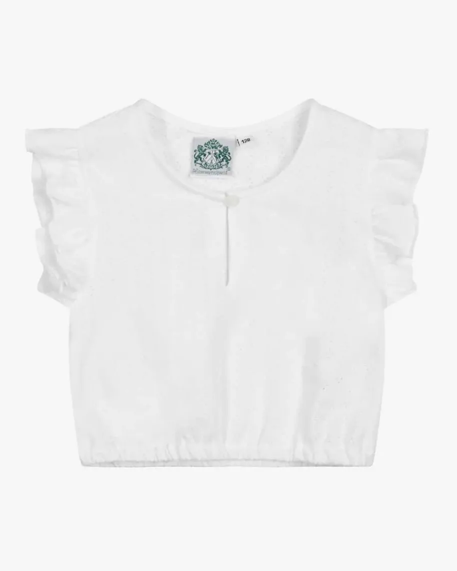 Caro Dirndlbluse für Mädchen von Hammerschmid in Weiß. Das Modell überzeugt intraditioneller Aufmachung, während die elastische Baumwoll-Qualität eineangenehme Haptik verspricht.