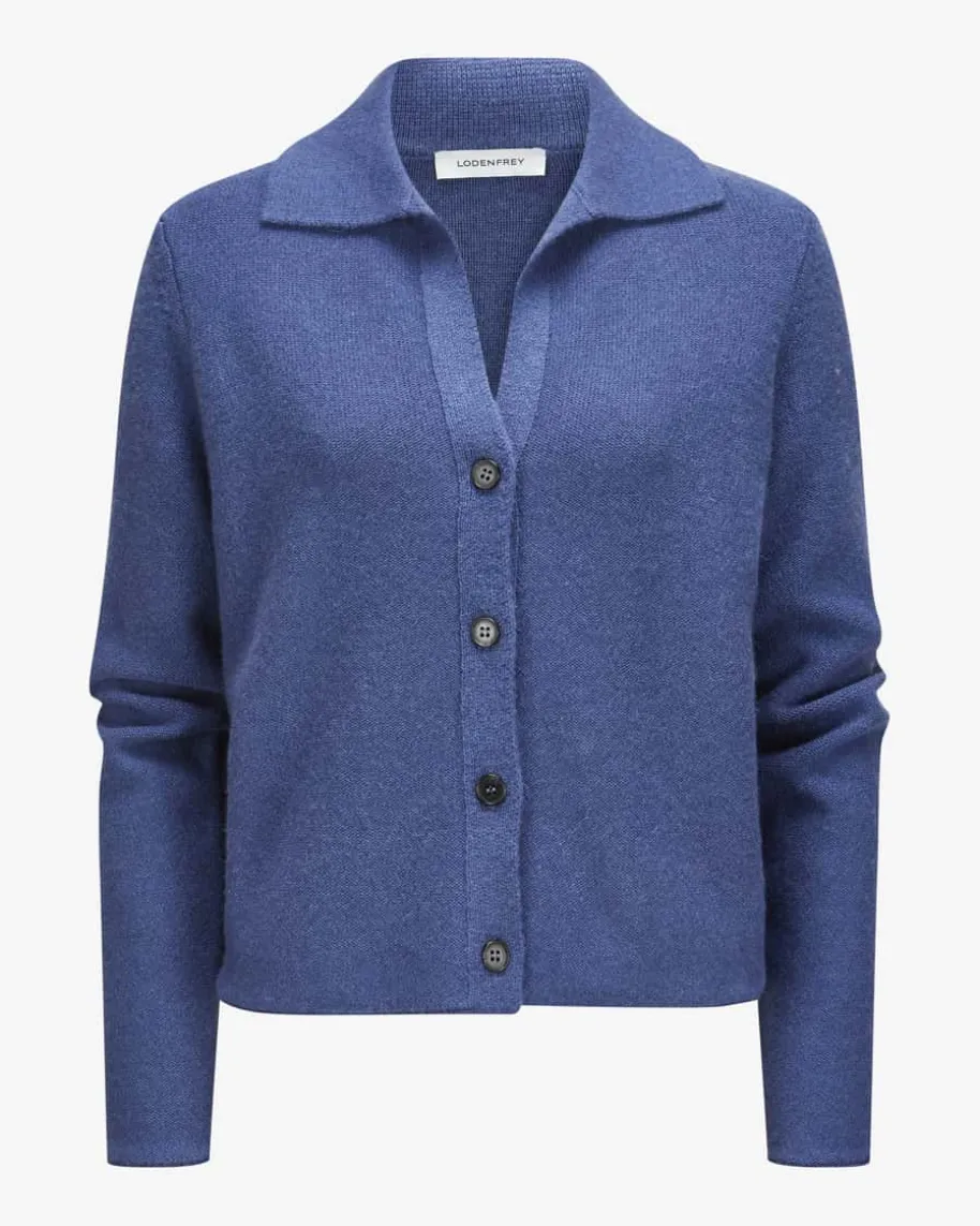 Cashmere-Strickjacke für Damen von LODENFREY in Rauchblau. Das zeitlose Modellavanciert dank der weichen Cashmere-Qualität zu einem wahren Alltagsfavoriten,während der Umlegekragen mit V-Ausschnitt einen modernen Charakter verleiht.