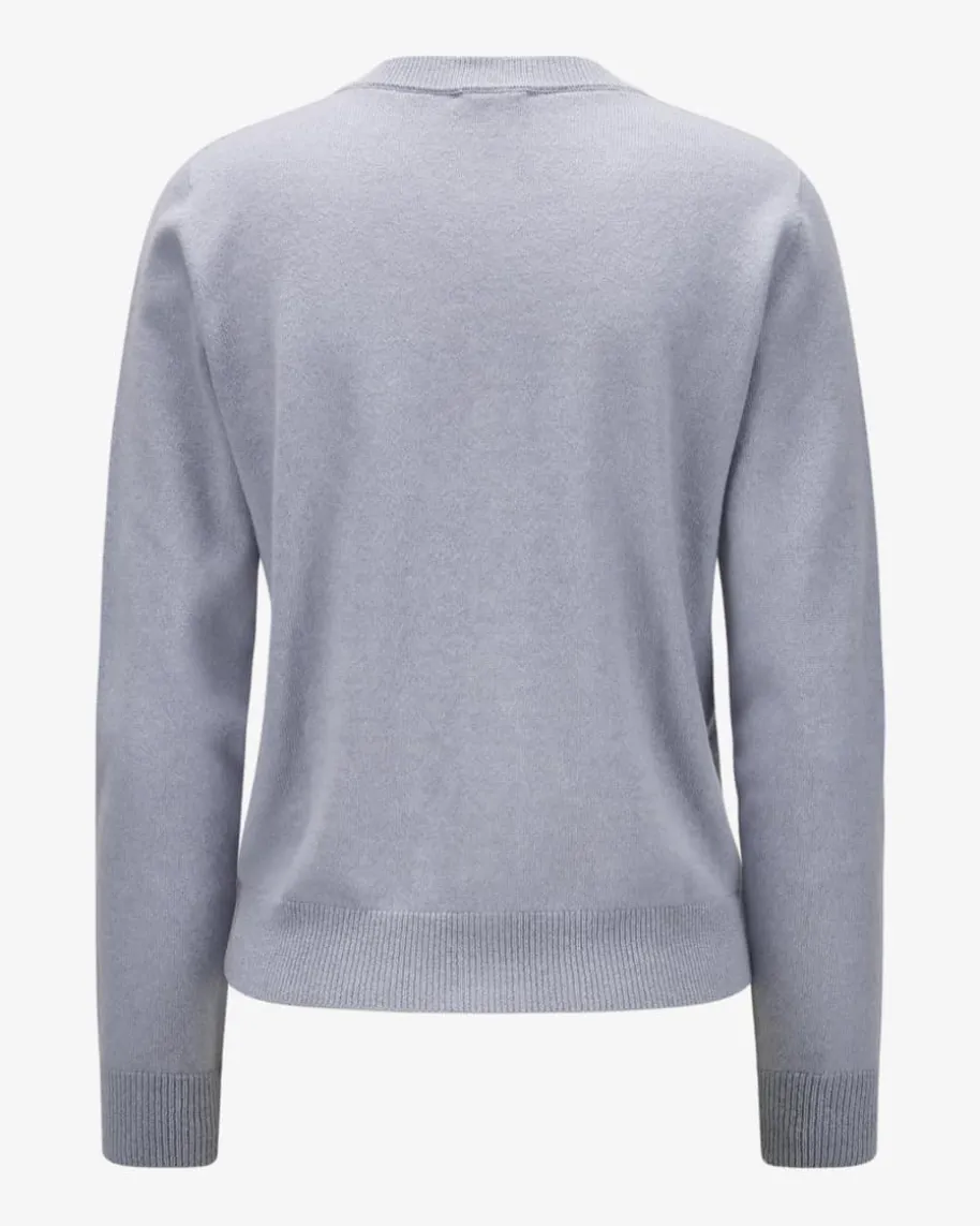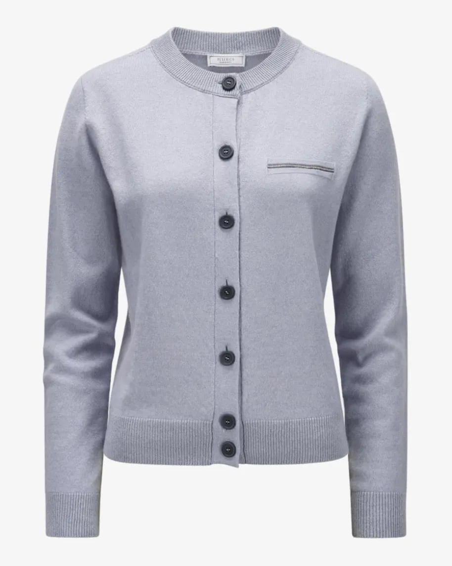 Cashmere-Strickjacke für Damen von Peserico in Hellblau. Fashion fürstilbewusste Damen, die cleane Mode aus Italien lieben – Das Modell aus feinemCashmere-Mix präsentiert sich als vielseitiger Begleiter, während dieGlitzerfasern zusammen mit den labelypischen Schmuckketten-Applikationenmodische Akzente setzen.
