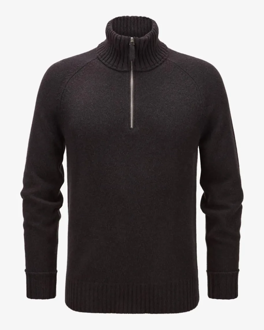 Cashmere-Troyer für Herren von FTC in Dunkelbraun. Das maskuline Modell erhältdurch den Troyerkragen und die markanten Rippstrick-Details einen legerenCharakter, während die hochwertige Fair Trade Cashmere-Wolle eine besondersweiche Haptik verleiht.