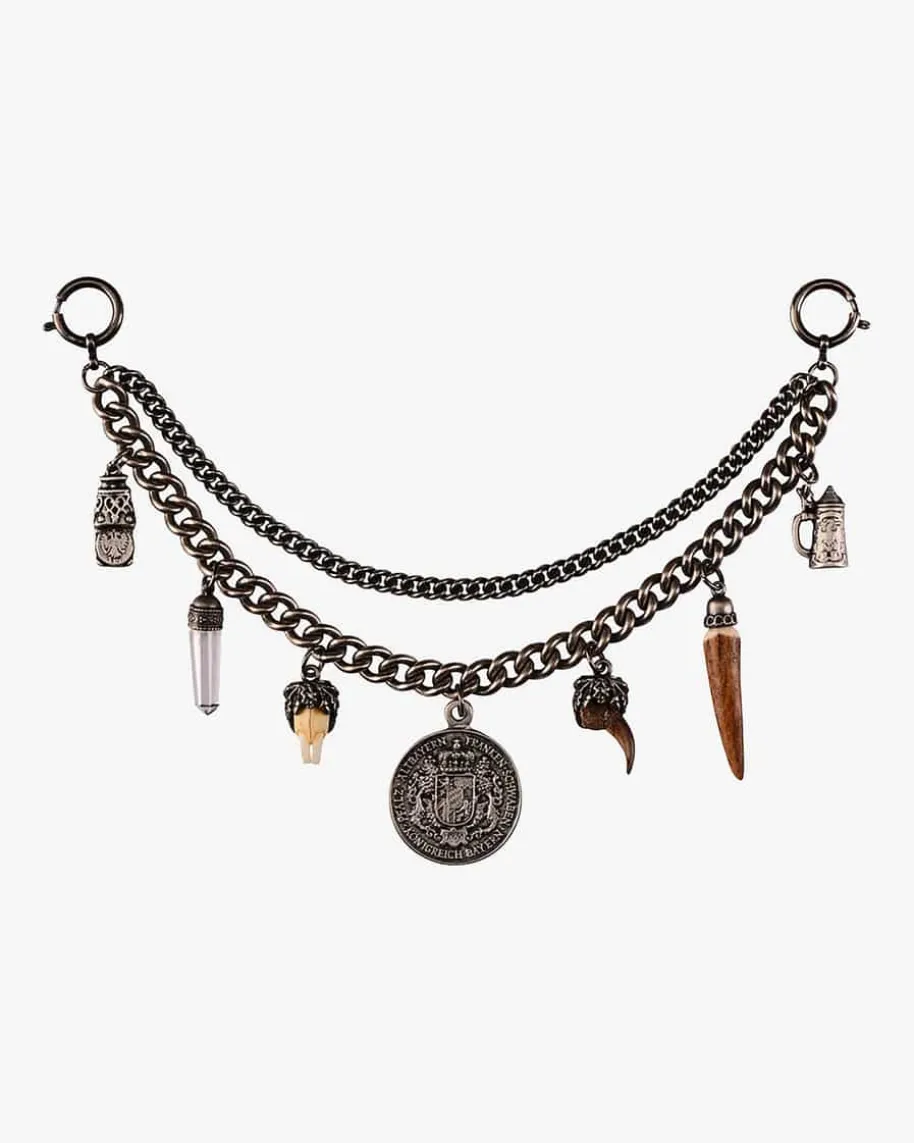 Charivari für Herren von Stephan. Das aus massiven Ketten-Gliedern gefertigte Charivari ist mit zahlreichen Anhängern im traditionell-rustikalen Stil versehen. Zwei Reihen schaffen einen edlen Akzent.